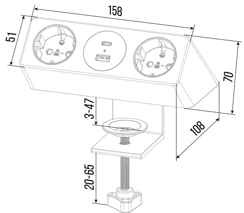 - 3 розетки, евро (max 250V, max 16A) - 2 порта для подзарядки устройств 3.1A USB-A, USB-C - Кабель 2 метра с евро-вилкой - Устанавливается на торец столешницы/полки, не требует выреза