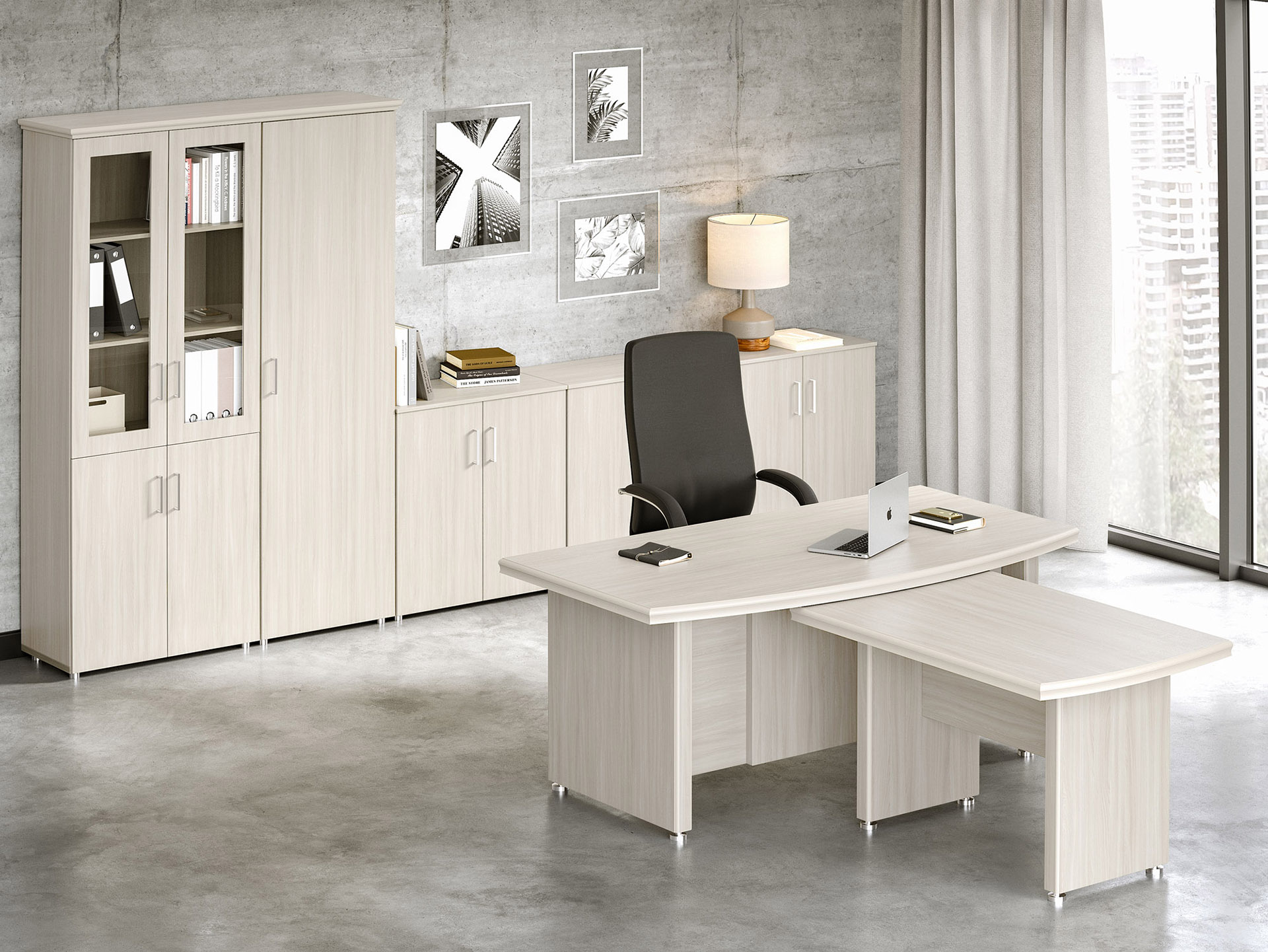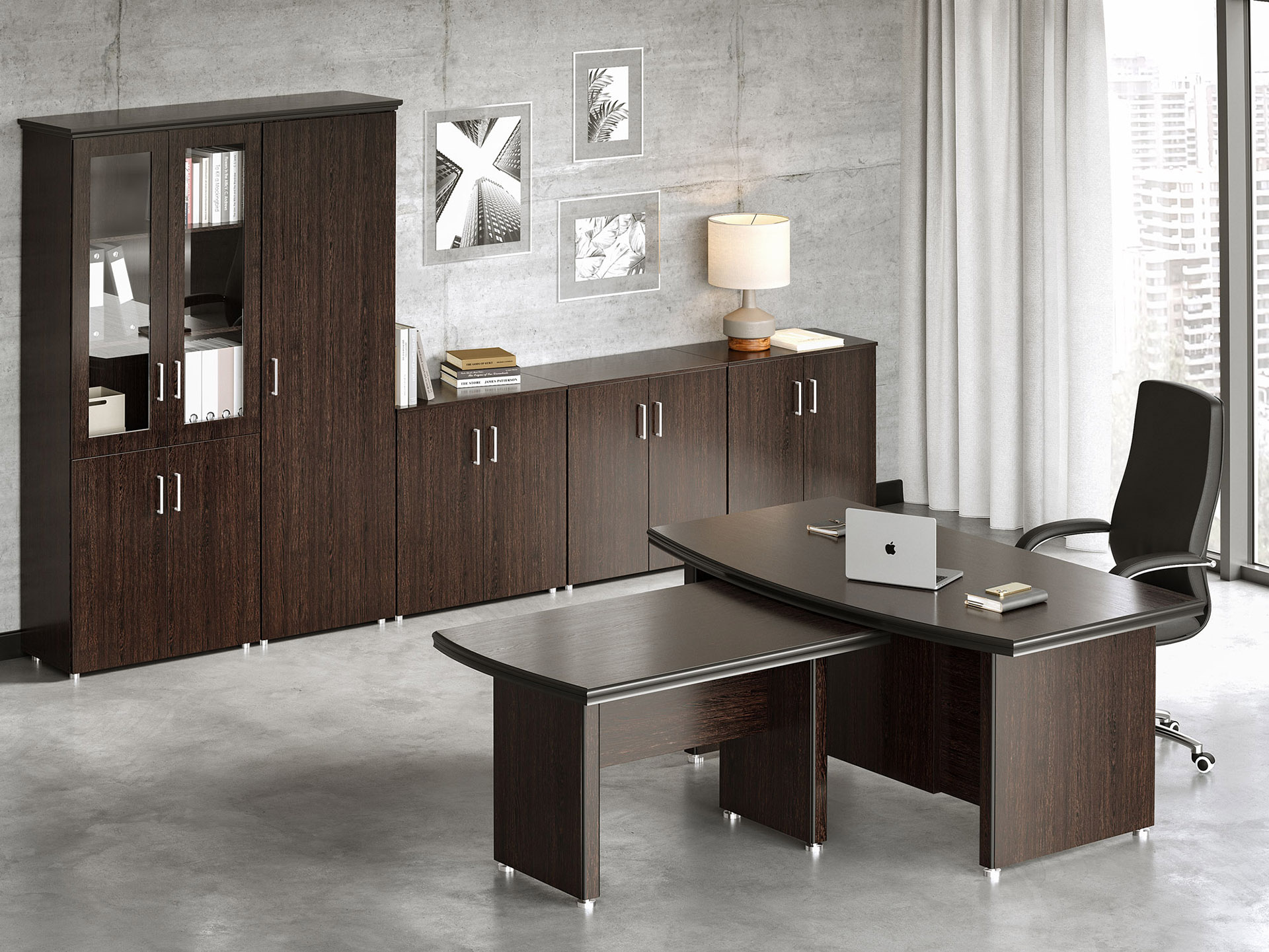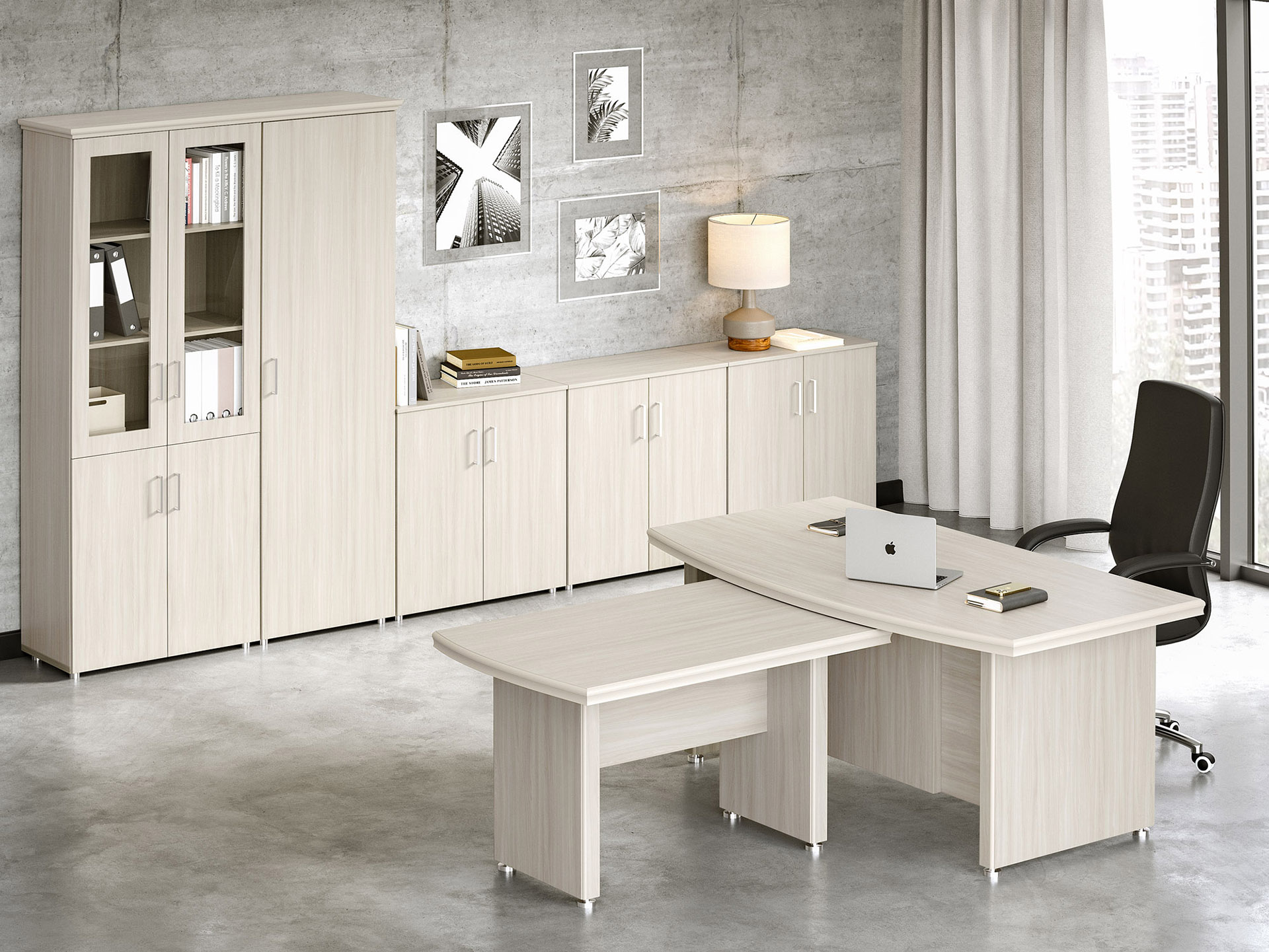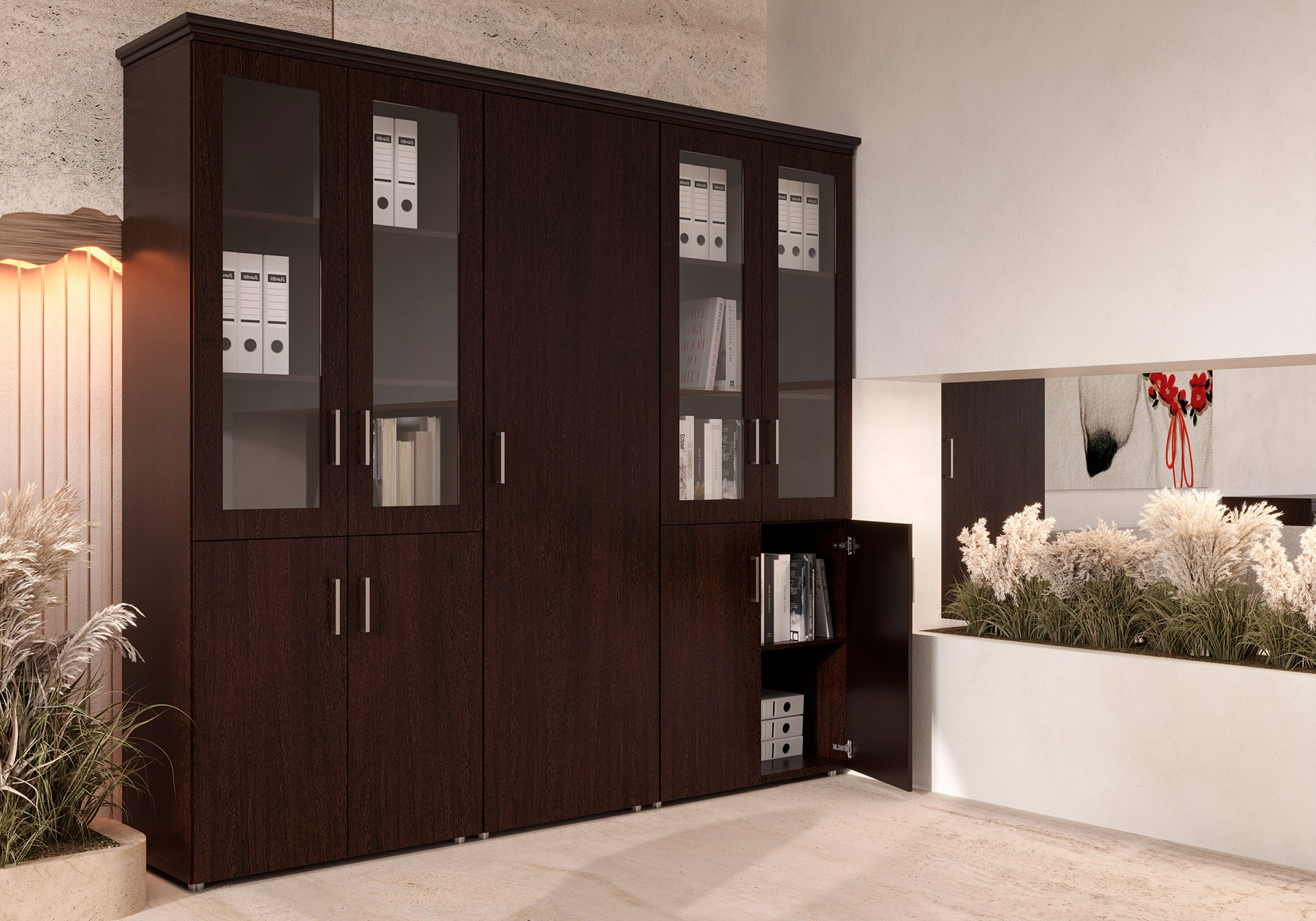 Особенности: прозрачное стекло в раме МДФ, регулируемые опоры, петли с доводчиками — делают использование максимально удобным. Идеальный выбор для тех, кто стремится создать престижное и уютное рабочее пространство.