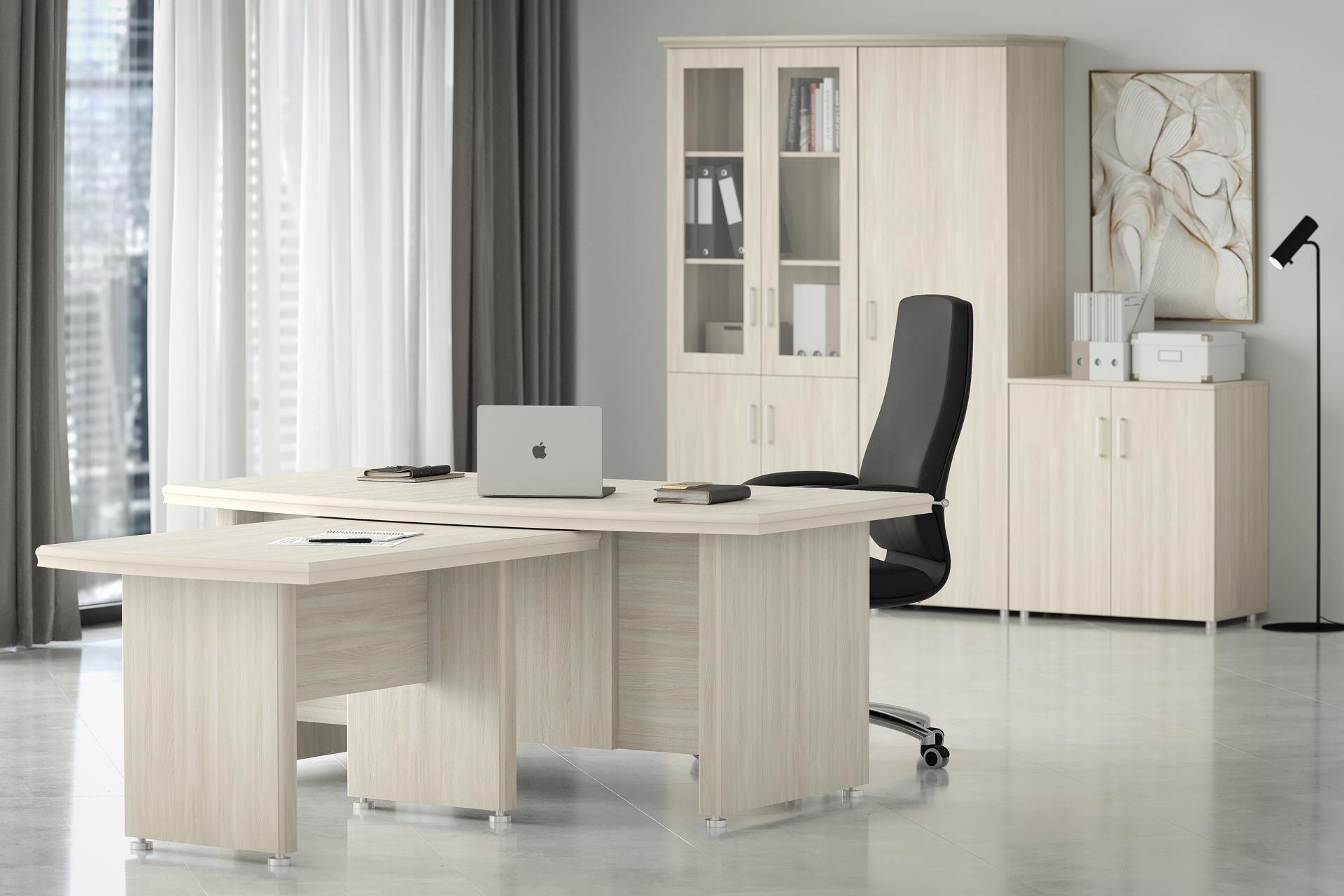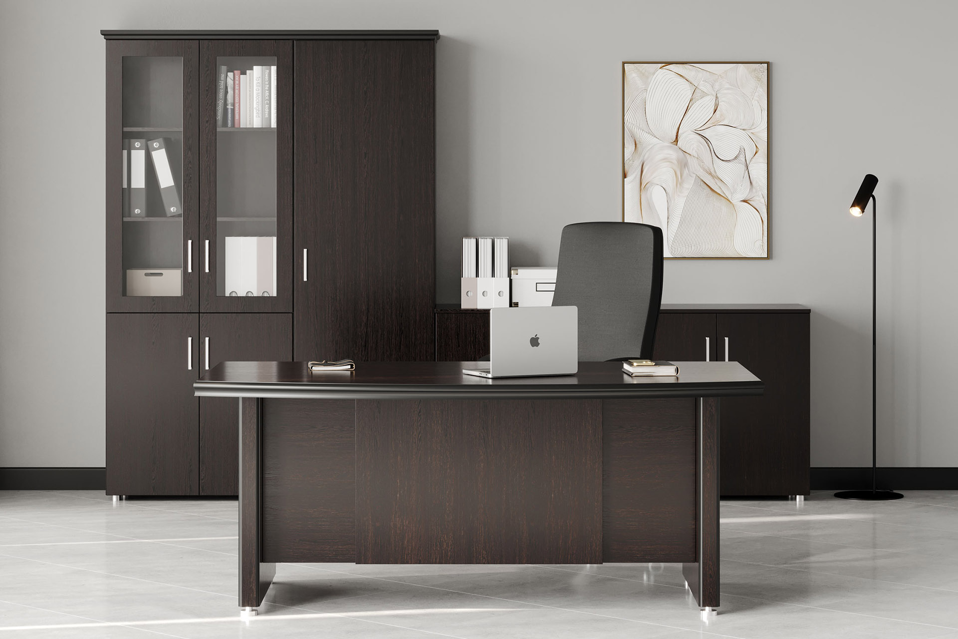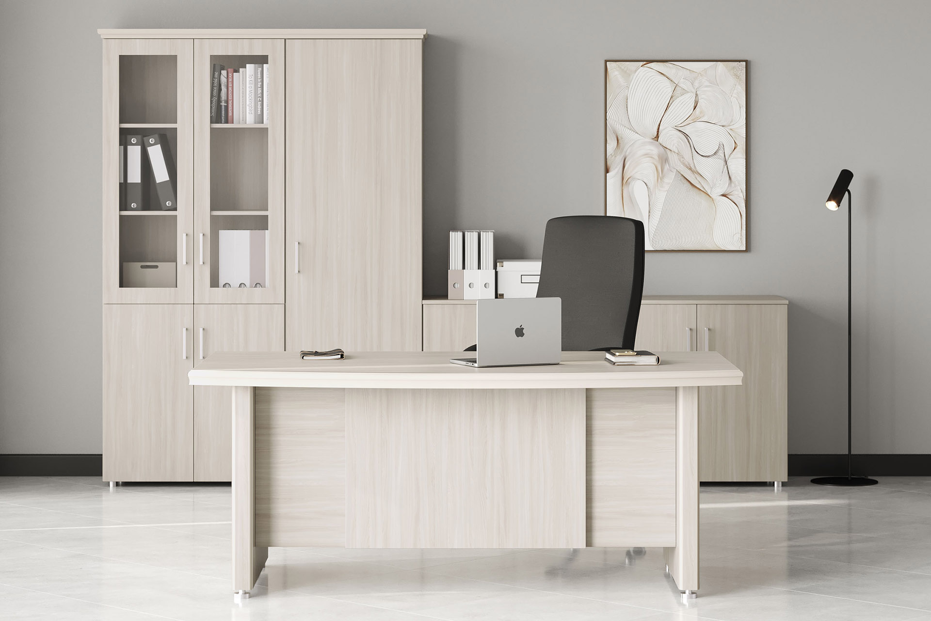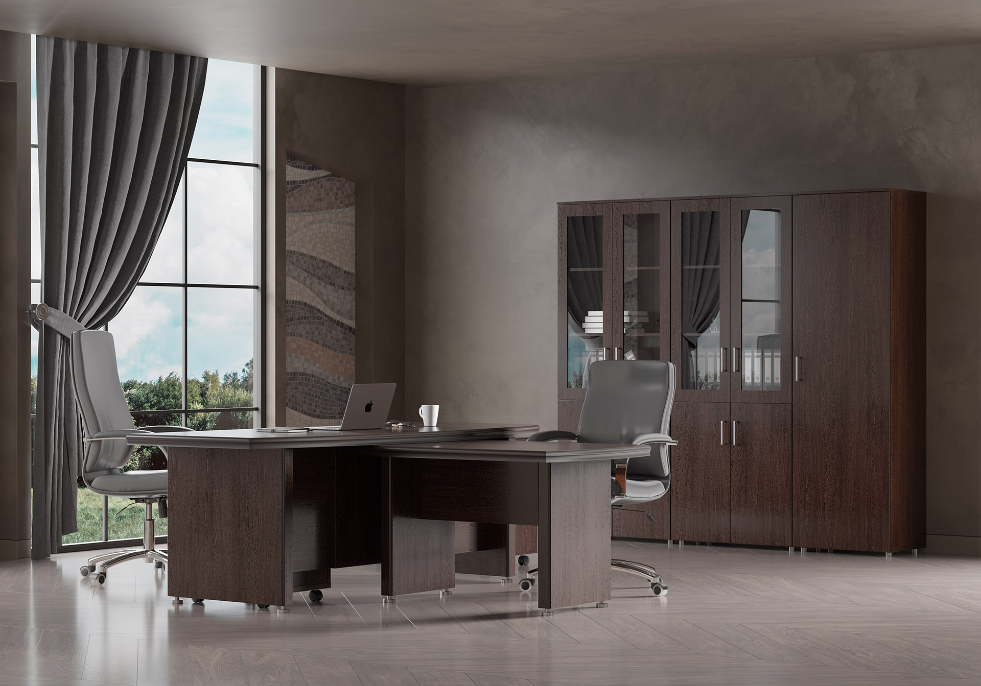 Особенности: прозрачное стекло в раме МДФ, регулируемые опоры, петли с доводчиками — делают использование максимально удобным. Идеальный выбор для тех, кто стремится создать престижное и уютное рабочее пространство.