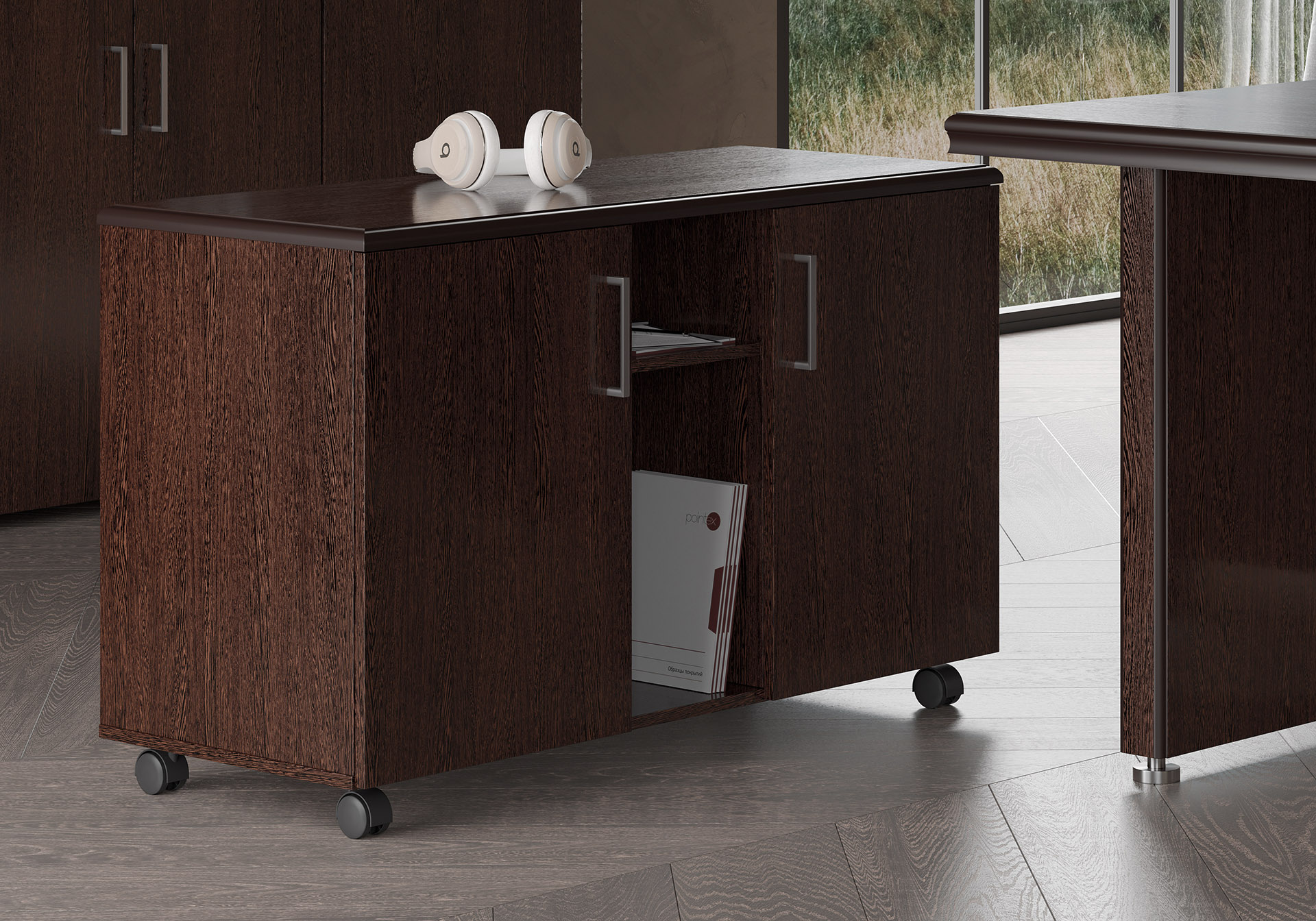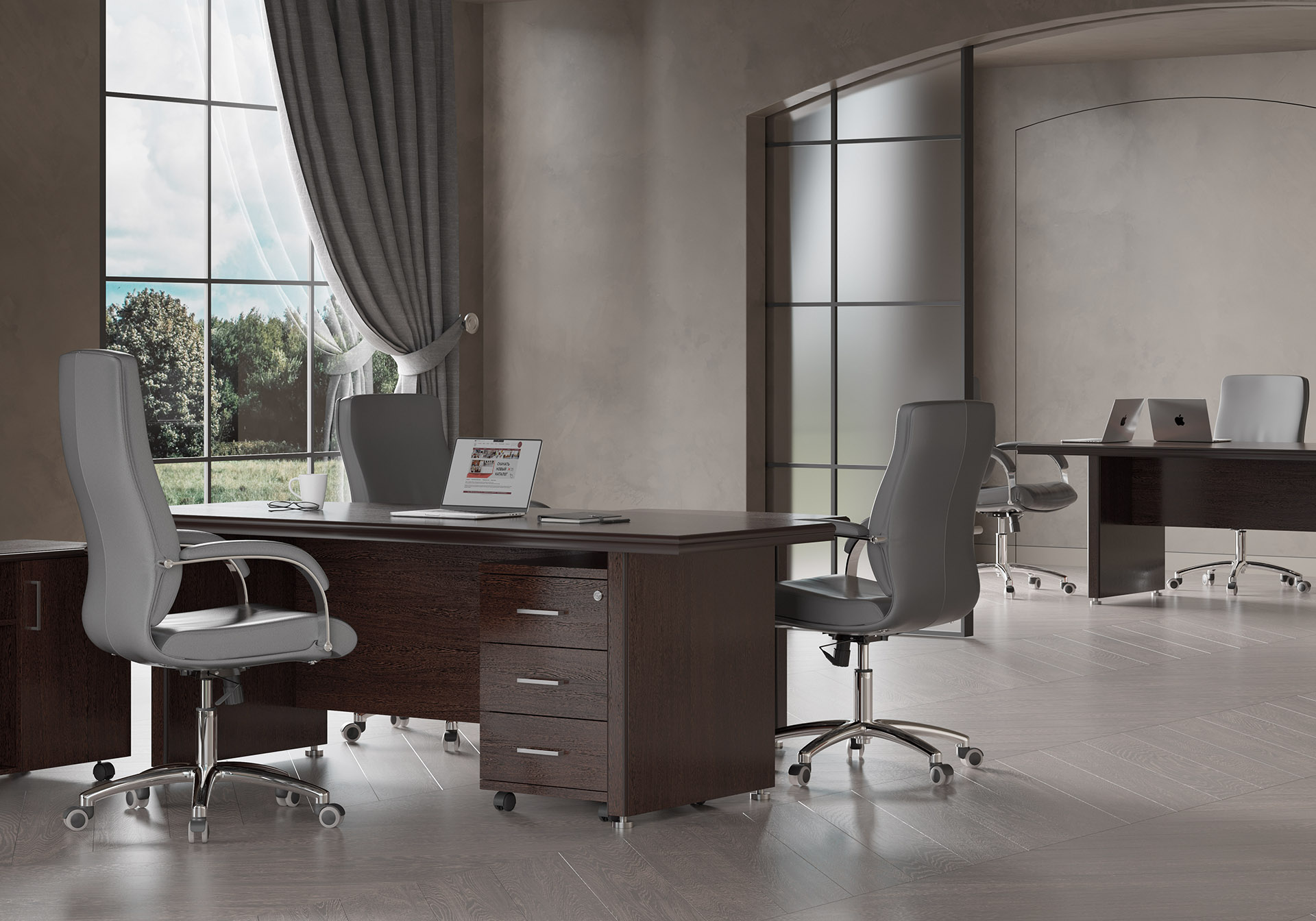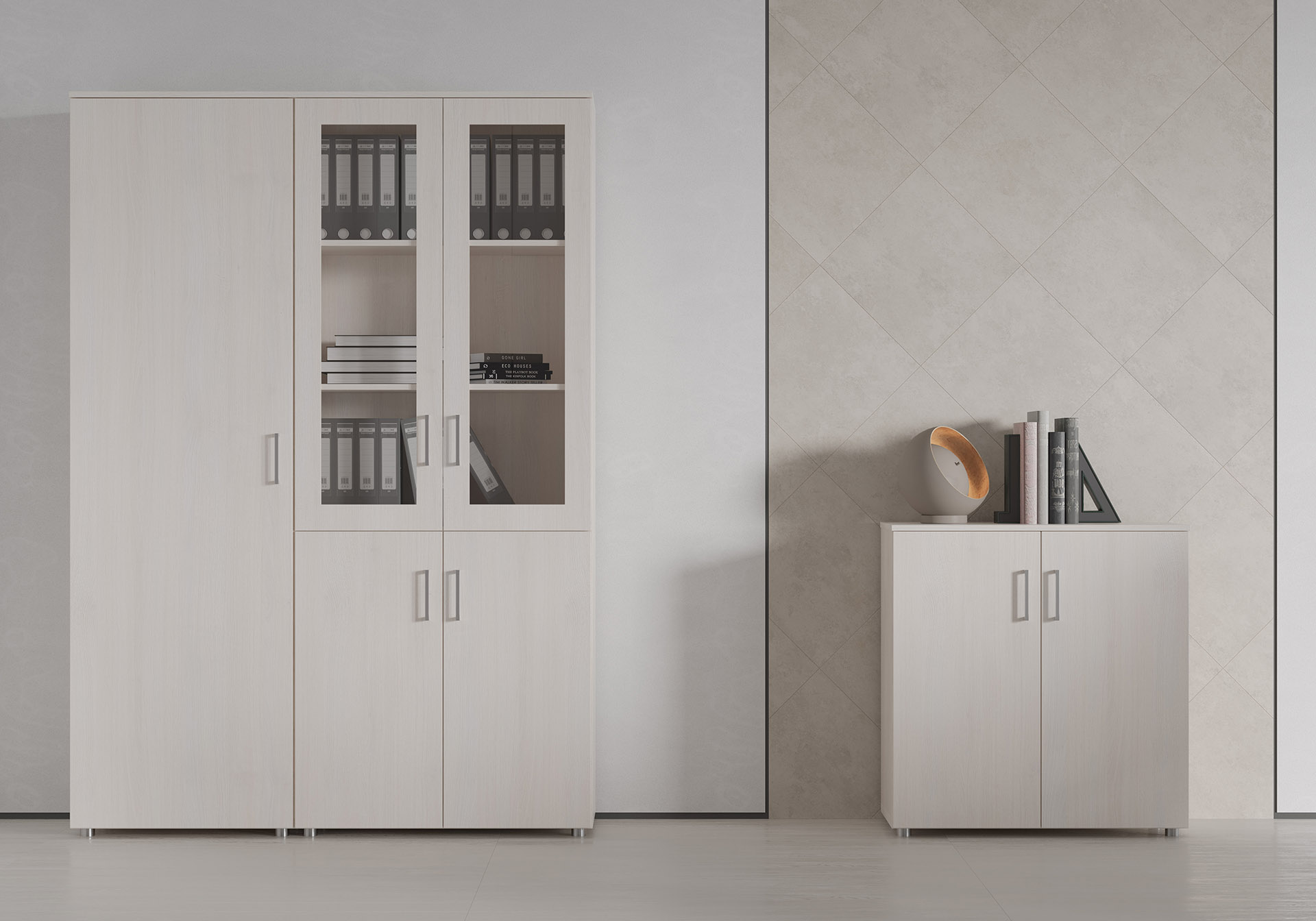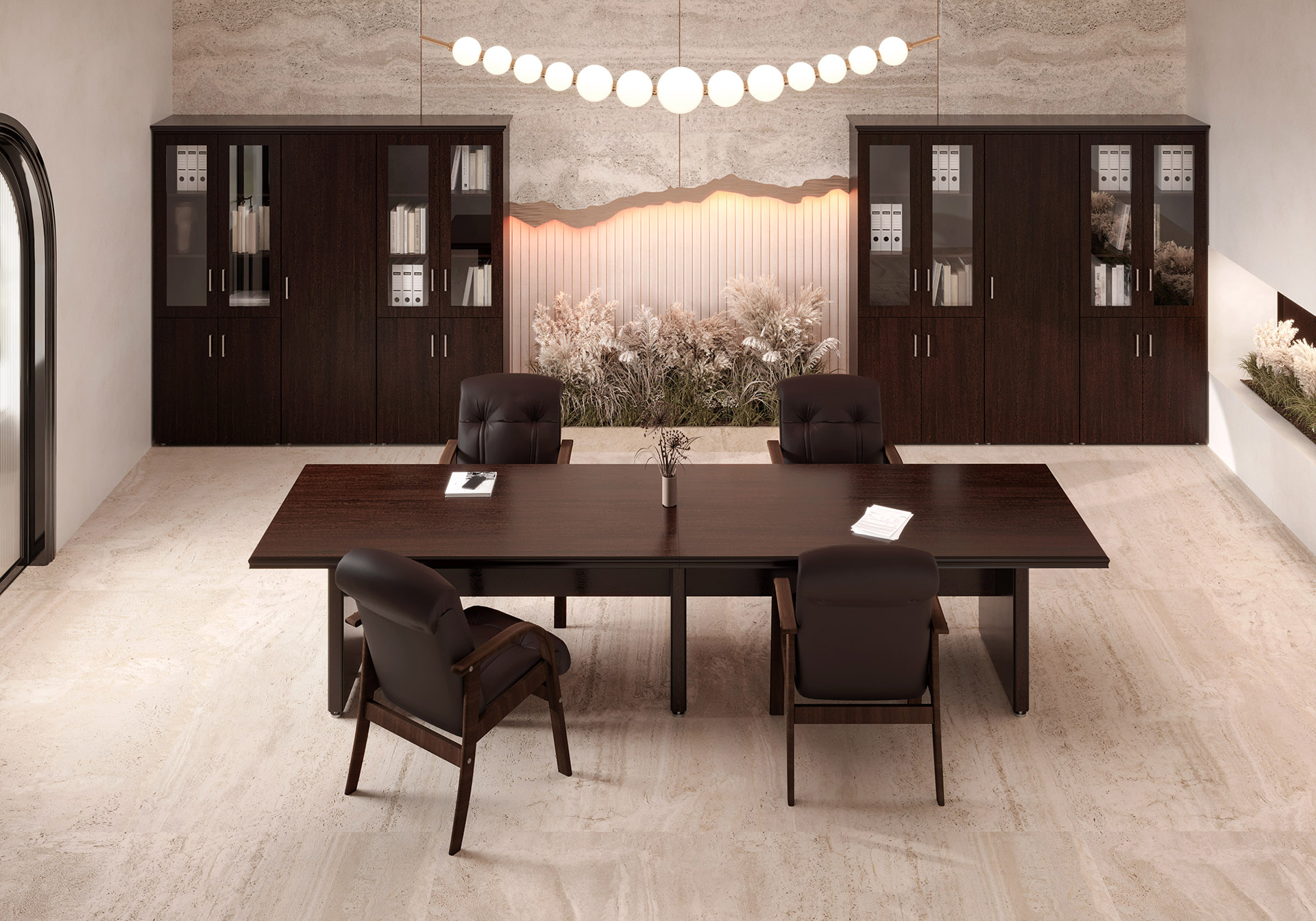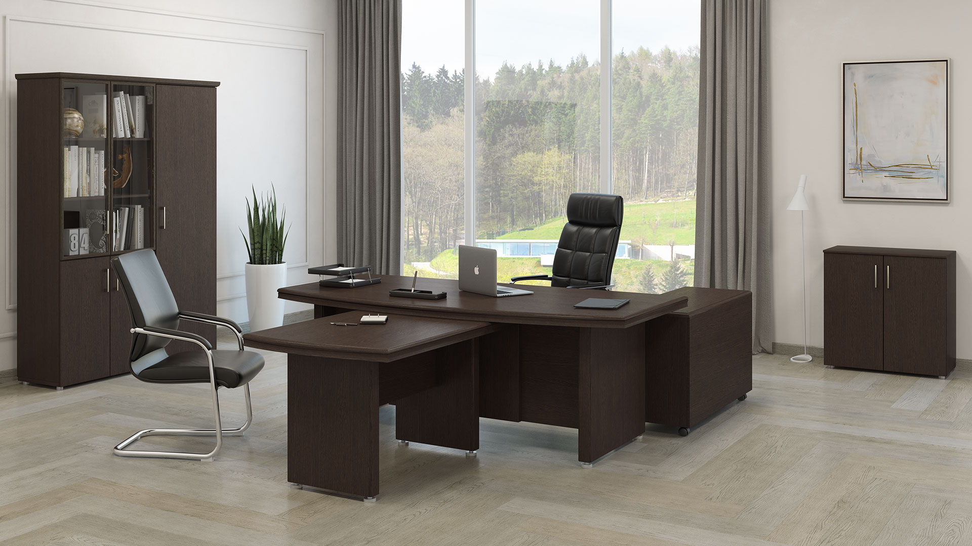 Особенности: прозрачное стекло в раме МДФ, регулируемые опоры, петли с доводчиками — делают использование максимально удобным. Идеальный выбор для тех, кто стремится создать престижное и уютное рабочее пространство.