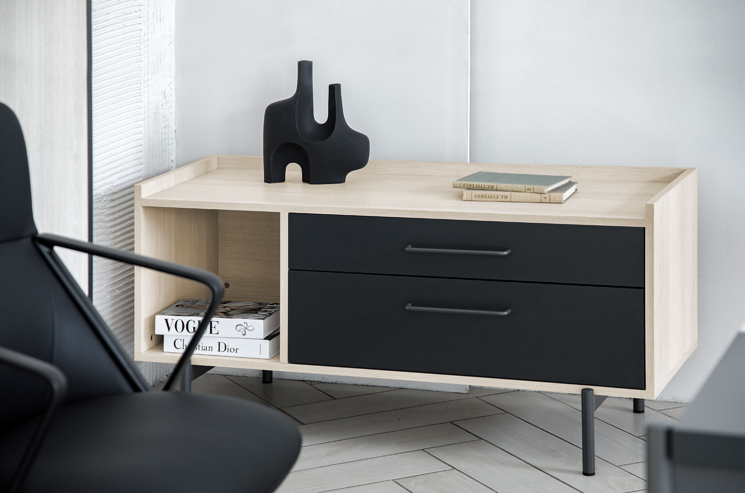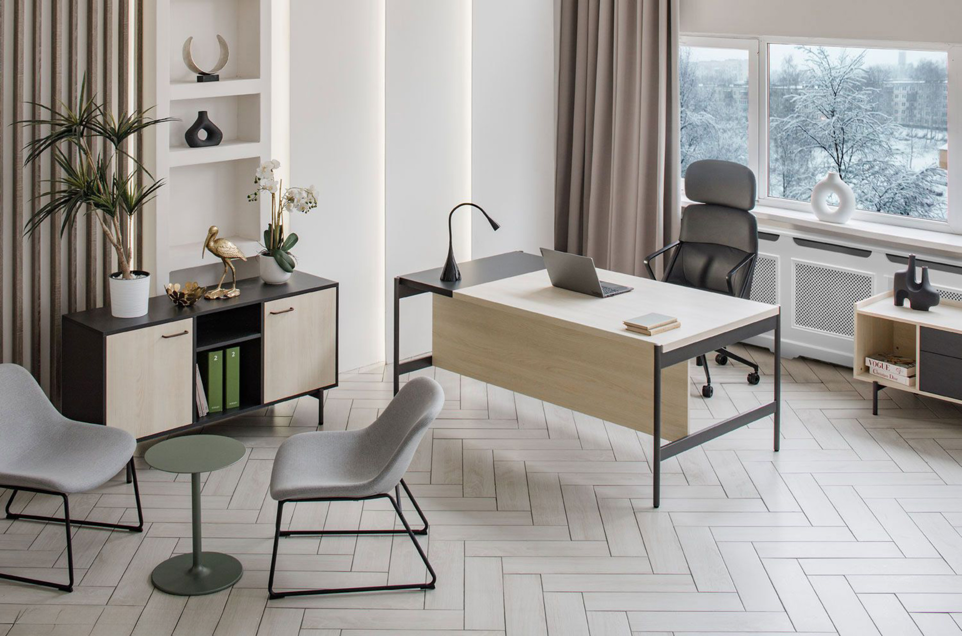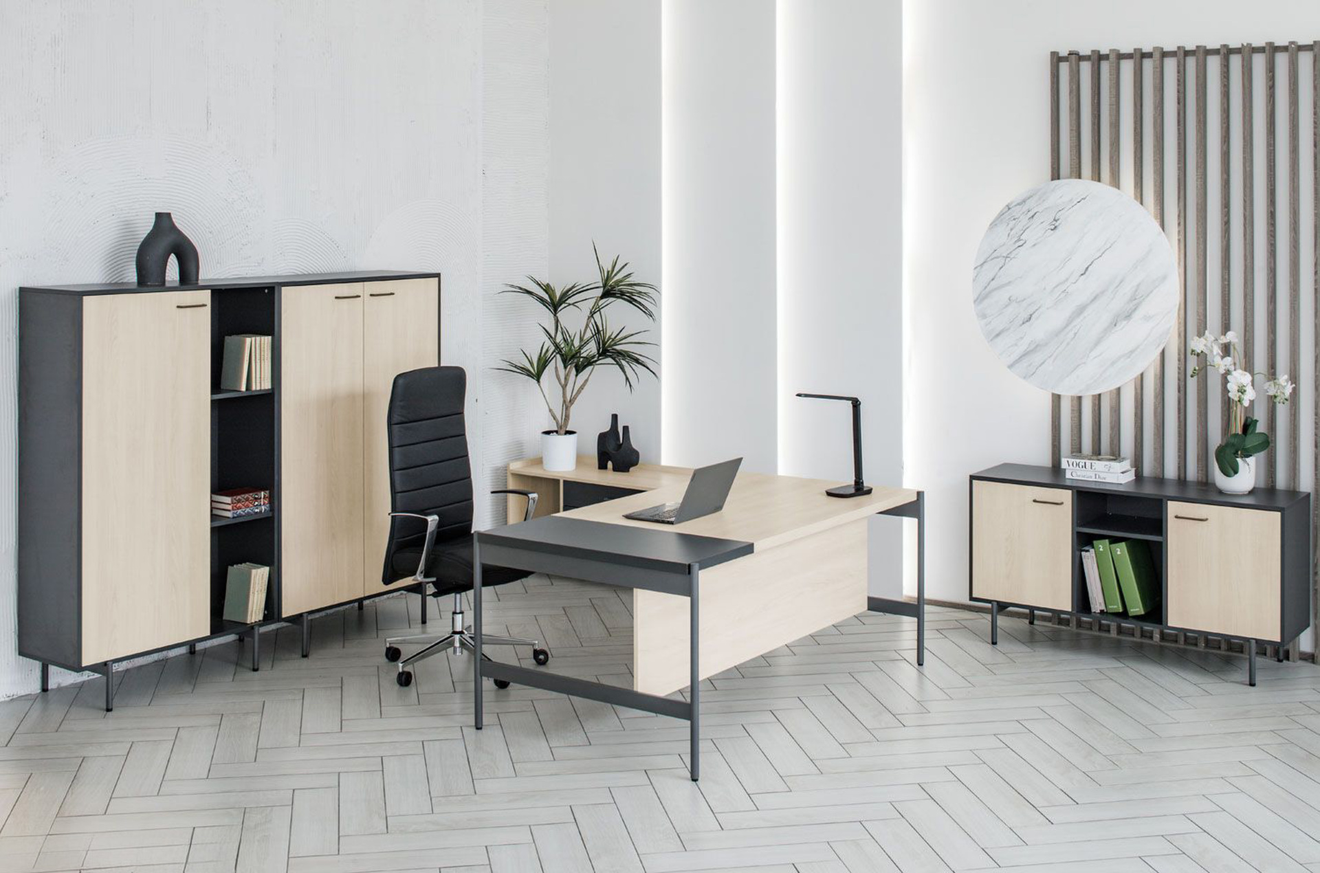 Светлый дуб изящно контрастирует с графитовым оттенком, добавляя глубину. Матовая поверхность антрацитовых металлических опор гармонично дополняет светлую столешницу, подчеркивая архитектуру кабинета. Каждая деталь продумана до мелочей, без случайных линий, только чистые формы и уважение к пространству.