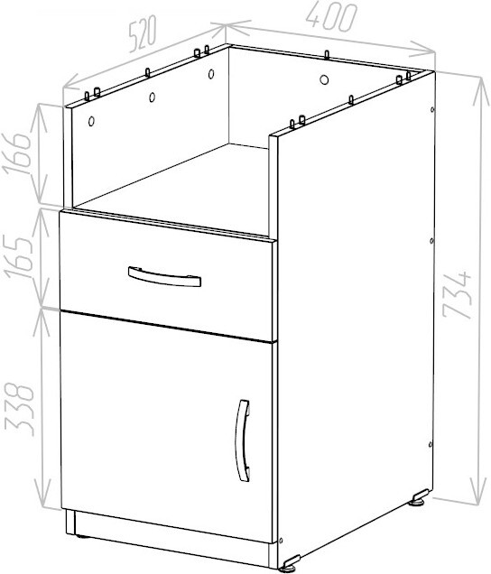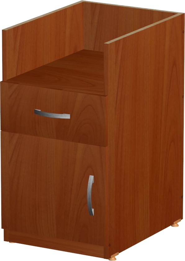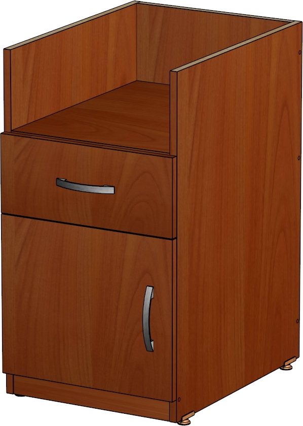Каркас изготовлен из ЛДСП 16 мм. Кромка ПВХ, на фасадах толщиной 2 мм., каркас и наполнение 0,4 мм. Задняя стенка тумбы изготовлена из ЛДСП 16 мм. Дно ящика изготовлено из ДВПО. Размеры внутреннего пространства ящика: высота 120 мм., глубина 484 мм. Направляющие шариковые полновыкатные. Регулируемые по высоте опоры. Габариты изделия (длина, ширина, высота): 400*540*734 Цвет изделия: вишня оксфорд