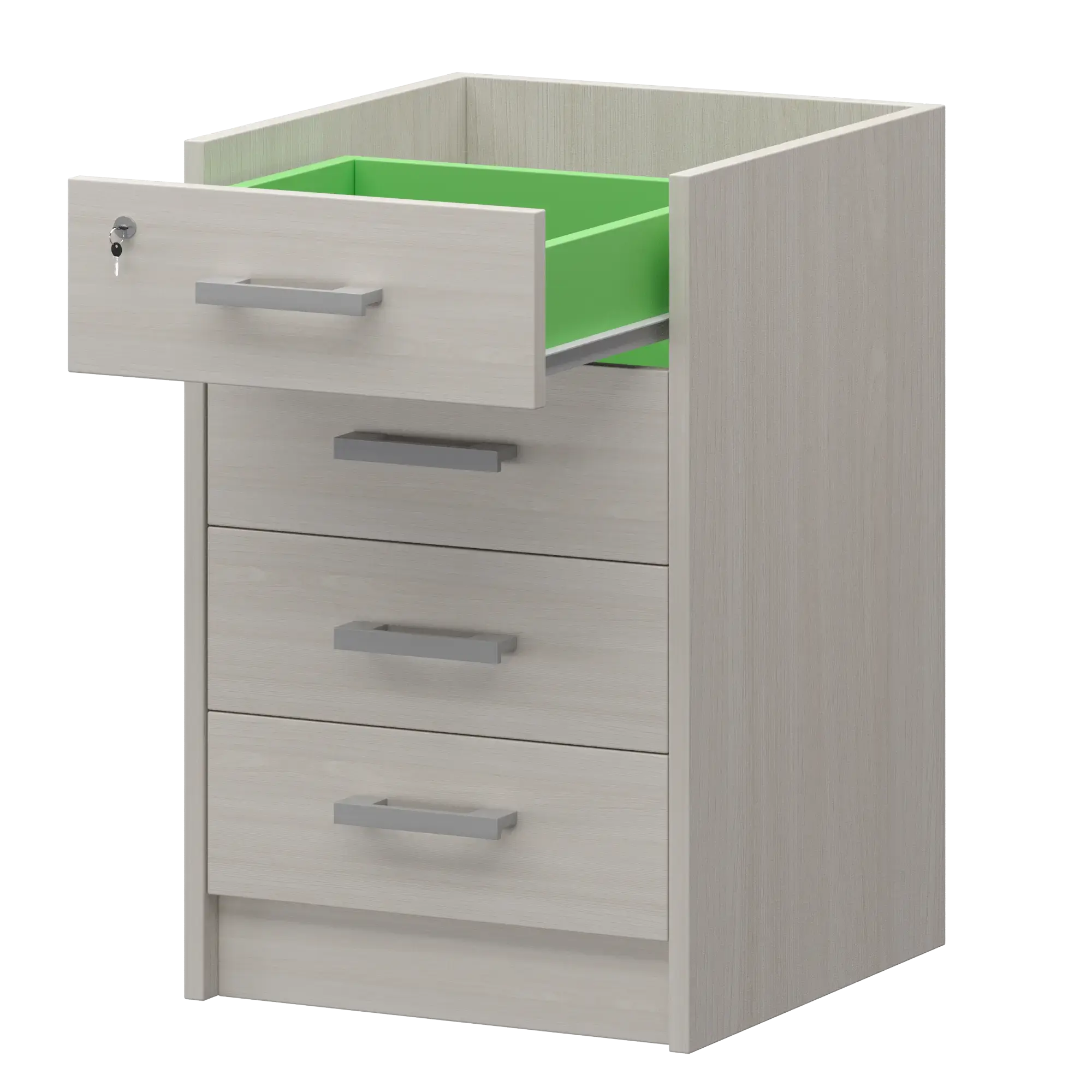 Тумбы Толщина ДСП каркасов, мм: 18 Кромка на каркасах, мм: 2, АВС Задняя стенка (мобильные тумбы): ЛДСП, 18 мм Задняя стенка (приставные тумбы): ЛДСП, 18 мм Стенки ящиков (кроме АТ-10): ЛДСП , 16мм цвет лайм Дно ящика: ЛХДФ Замок: На верхний ящик, на всех тумбах, на тумбах-купе-центральный Толщина ДСП лицевых панелей, мм: 18 Кромка на лицевых панелях ящиков, мм: 0,4 Толщина топа, мм: 22 Кромка топа, мм: 2, АВС Диаметр колес, мм: 40