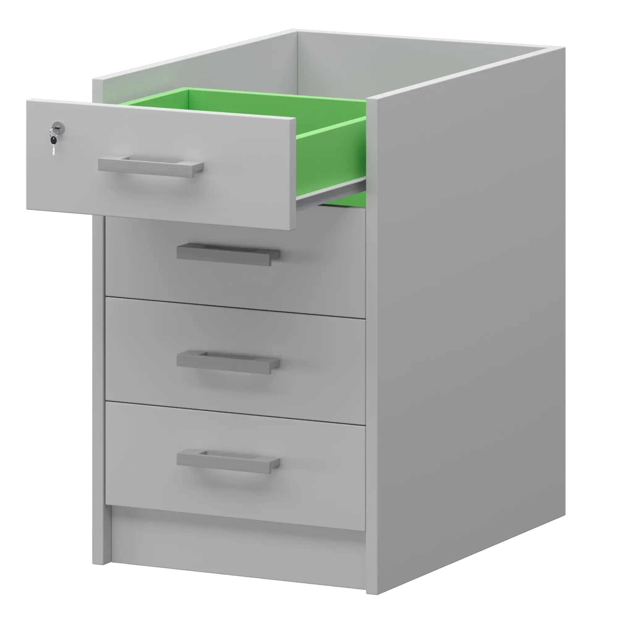 Тумбы Толщина ДСП каркасов, мм: 18 Кромка на каркасах, мм: 2, АВС Задняя стенка (мобильные тумбы): ЛДСП, 18 мм Задняя стенка (приставные тумбы): ЛДСП, 18 мм Стенки ящиков (кроме АТ-10): ЛДСП , 16мм цвет лайм Дно ящика: ЛХДФ Замок: На верхний ящик, на всех тумбах, на тумбах-купе-центральный Толщина ДСП лицевых панелей, мм: 18 Кромка на лицевых панелях ящиков, мм: 0,4 Толщина топа, мм: 22 Кромка топа, мм: 2, АВС Диаметр колес, мм: 40