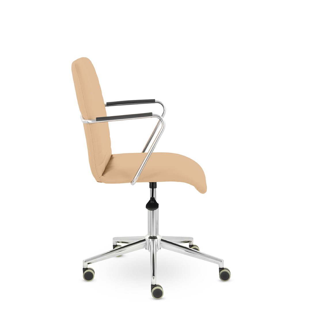 Уникальный каркас из металла и узкие хромированные подлокотники с небольшими пластиковыми накладками придают конструкции легкость и прочность. Горизонтальные строчки на спинке подчеркивают элегантный и современный вид.