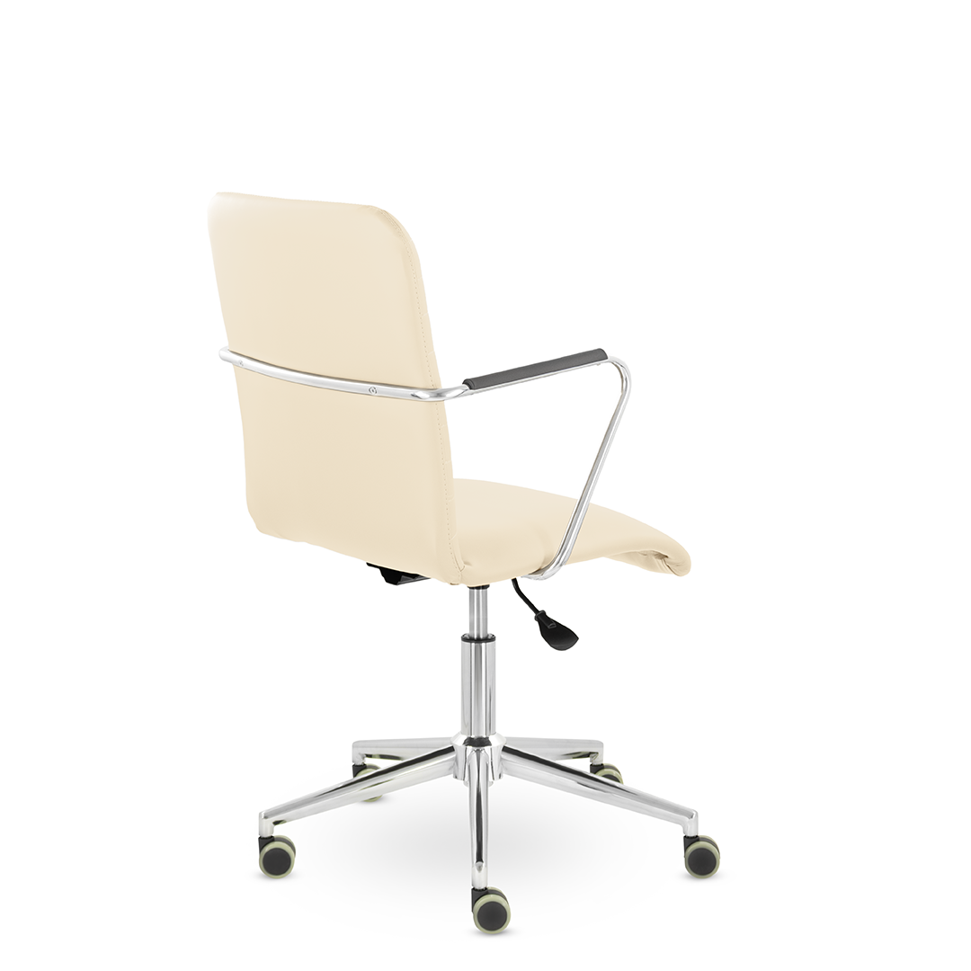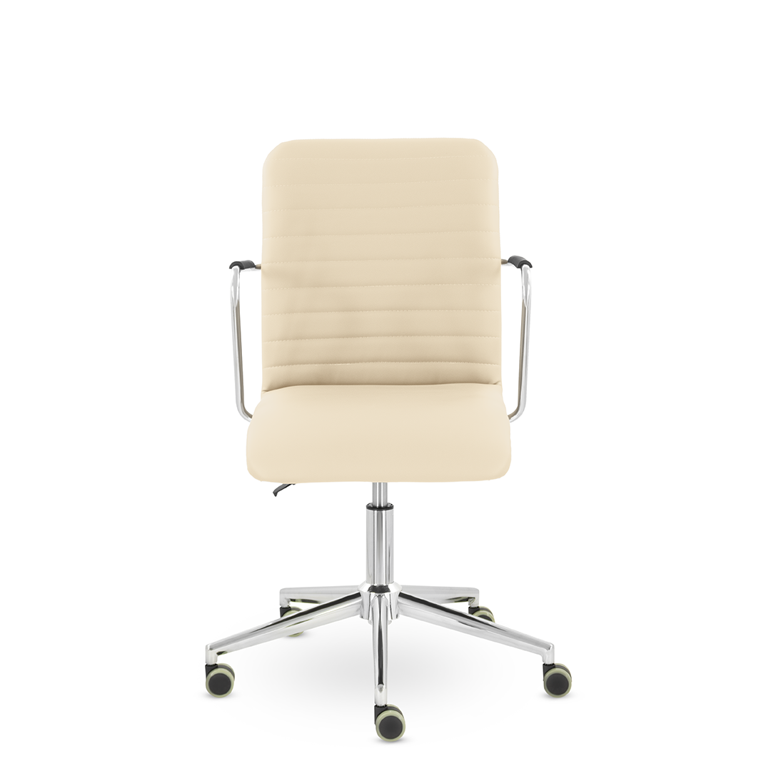 Уникальный каркас из металла и узкие хромированные подлокотники с небольшими пластиковыми накладками придают конструкции легкость и прочность. Горизонтальные строчки на спинке подчеркивают элегантный и современный вид.
