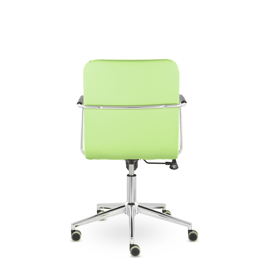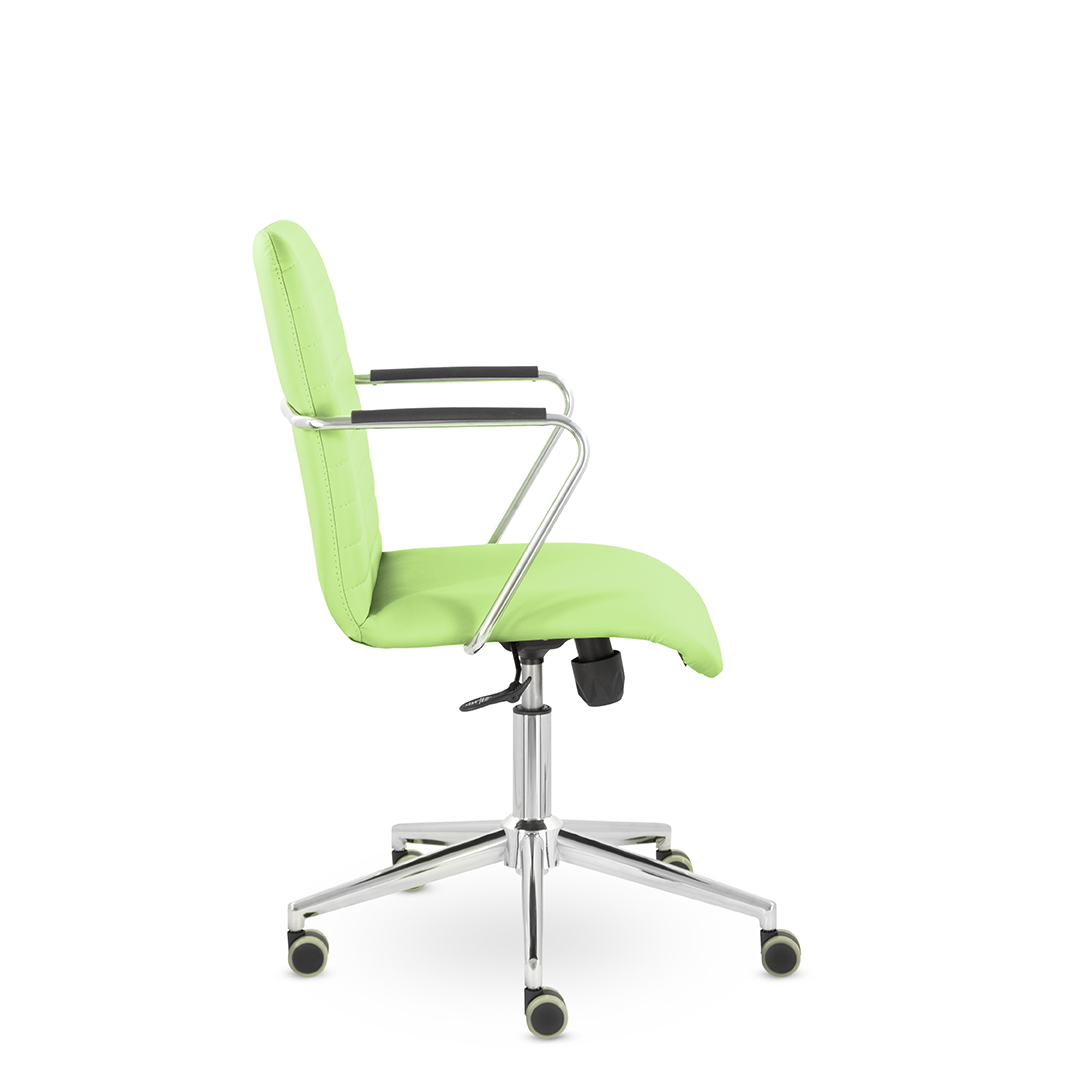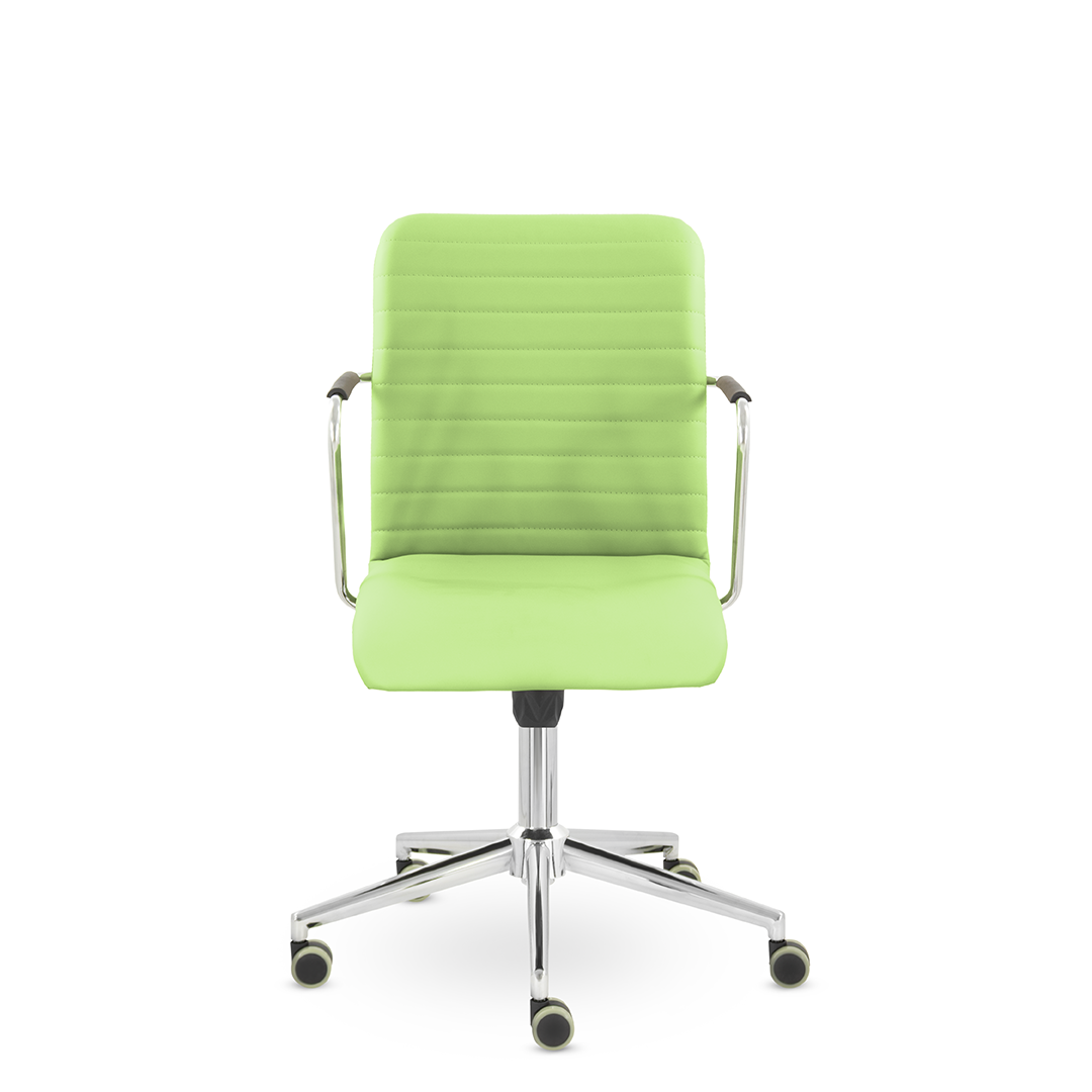 Уникальный каркас из металла и узкие хромированные подлокотники с небольшими пластиковыми накладками придают конструкции легкость и прочность. Горизонтальные строчки на спинке подчеркивают элегантный и современный вид. Хромированная крестовина выдерживает до 120 кг.