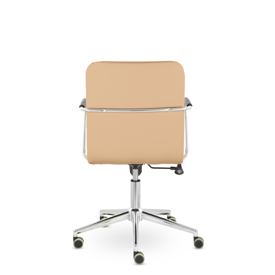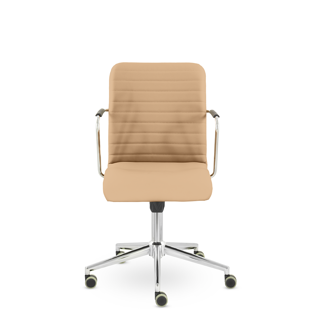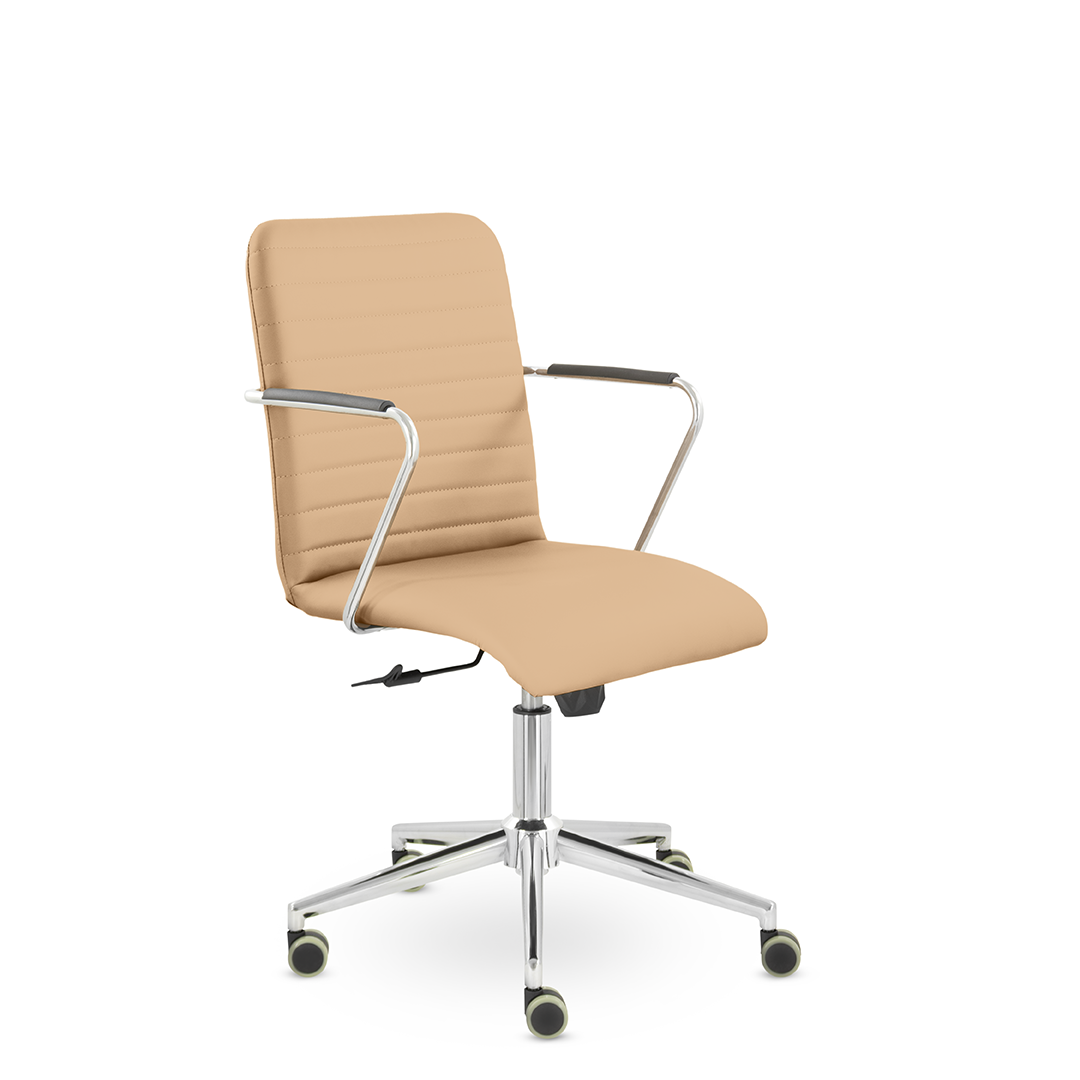 Уникальный каркас из металла и узкие хромированные подлокотники с небольшими пластиковыми накладками придают конструкции легкость и прочность. Горизонтальные строчки на спинке подчеркивают элегантный и современный вид. Хромированная крестовина выдерживает до 120 кг.