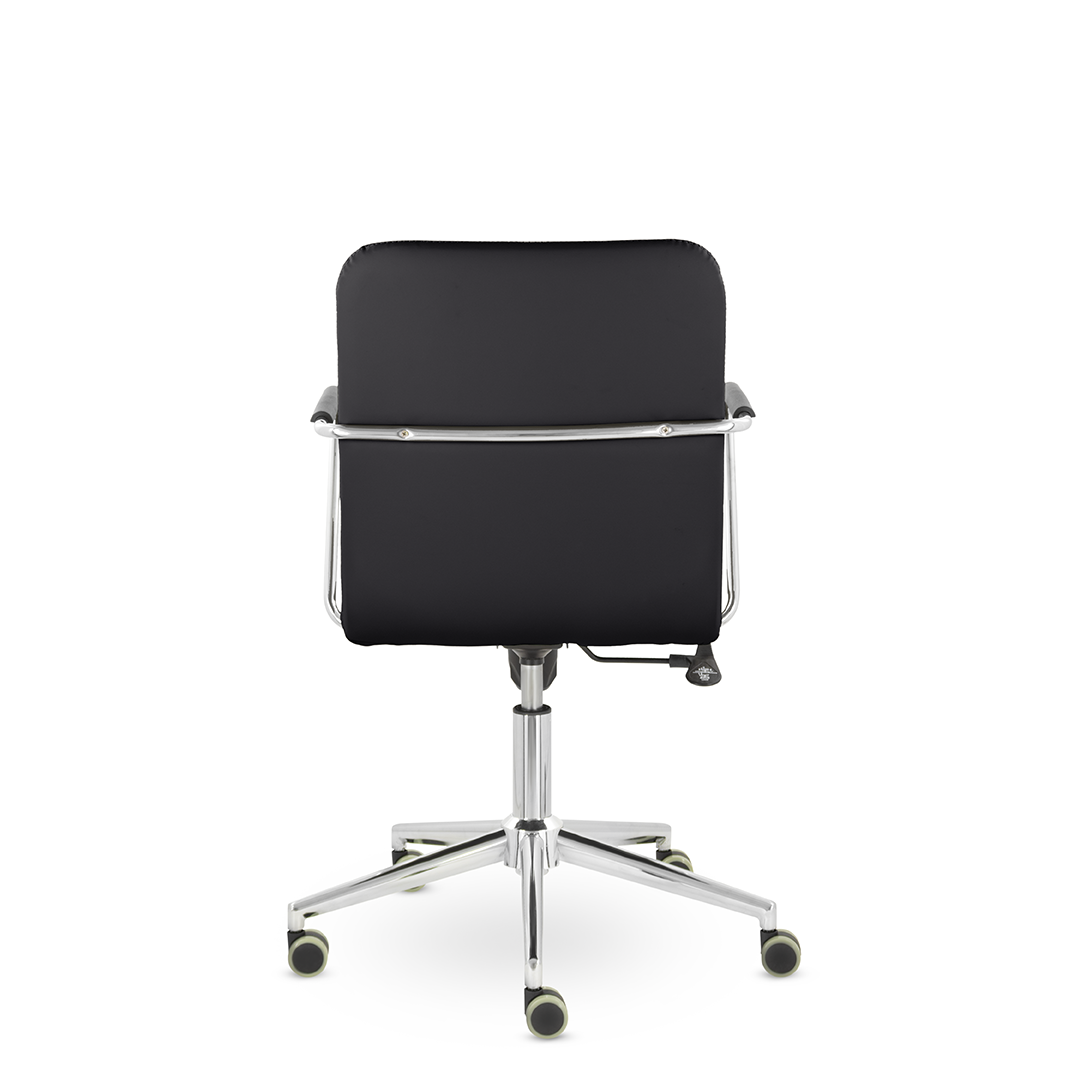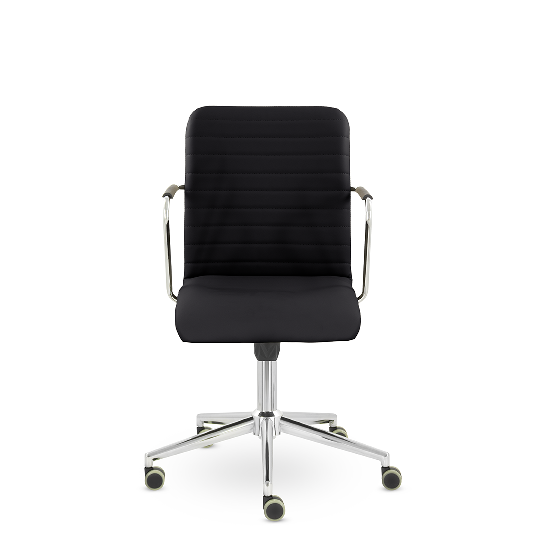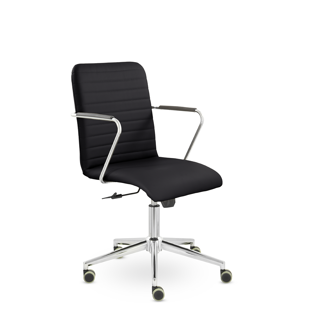 Уникальный каркас из металла и узкие хромированные подлокотники с небольшими пластиковыми накладками придают конструкции легкость и прочность. Горизонтальные строчки на спинке подчеркивают элегантный и современный вид. Хромированная крестовина выдерживает до 120 кг.
