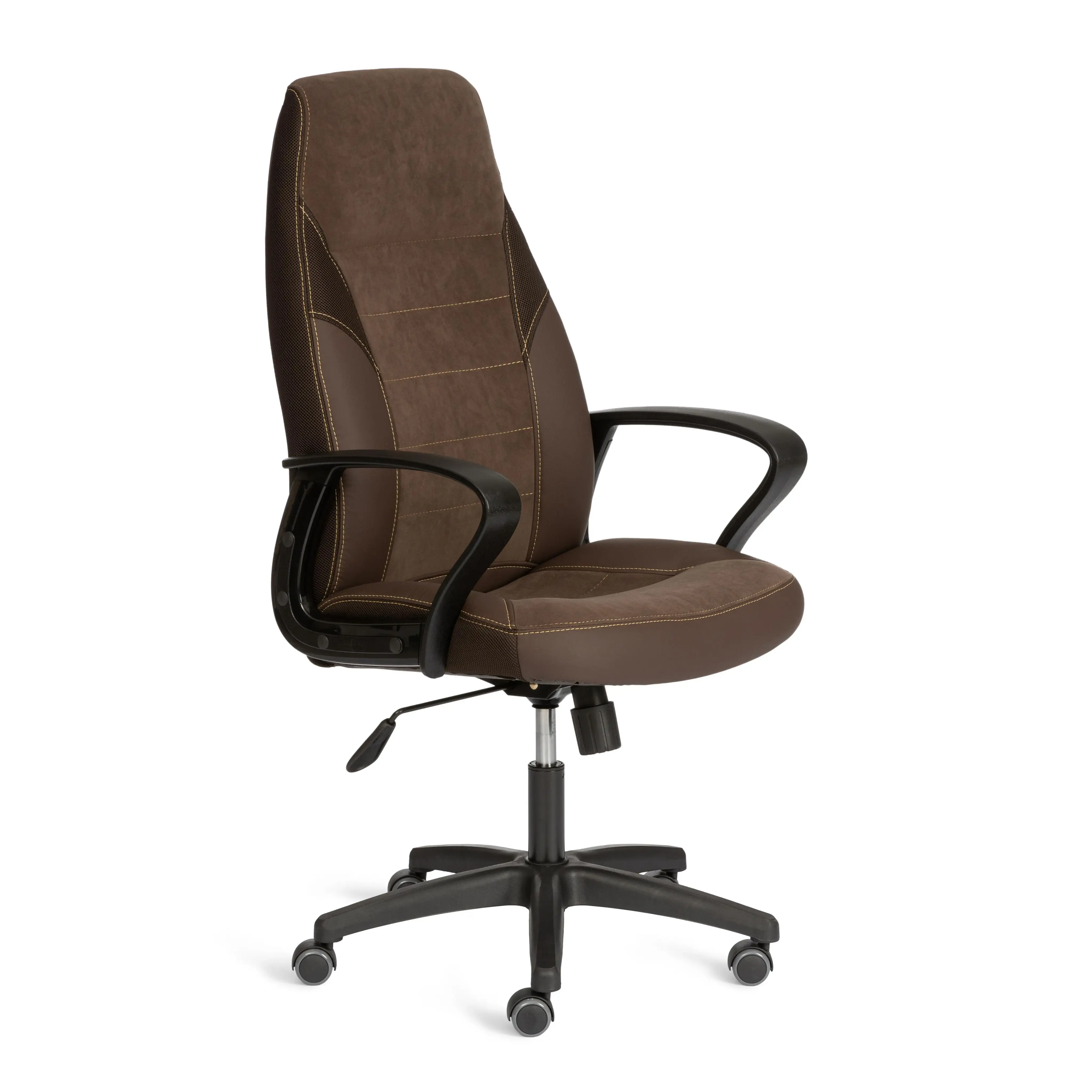 Уникальные черты компьютерного кресла INTER из коллекции OFFICE помогут довести интерьер вашего рабочего пространства до совершенства. Модель гармонично впишется в любое помещение, сочетая в себе функциональность и оригинальный внешний вид. Каркас из экологически безопасной фанеры толщиной более 10 мм гипоаллергенен и надежен. Широкое сиденье с мягким наполнителем из пенополиуретана (до 35 кг/м2) стандартной плотности легко подстраивается под контуры тела человека, обладает отличными эксплуатационными качествами. Высота и наклон с фиксацией в одном положении регулируется при помощи основательного механизма. Пластиковая крестовина с декоративными вставками и специальными насечками для предотвращения соскальзывания ног надежна, устойчива к частому использованию и усиленной эксплуатации. Полиуретановые ролики с прорезиненными вставками имеют тихий ход, подходят для использования на ламинате и паркете. Ролики и крестовина в креслах бренда TETCHAIR соответствуют стандарту BIFMA. Во всех креслах бренда TETCHAIR используются газлифты 3 класса, он способен выдерживать вес до 120 кг. Фиксированные пластиковые подлокотники с декоративными вставками снимут нагрузку с плеч и помогут расслабиться. Оригинальное сочетание высокопрочной износостойкой экокожи и крепкой ткани выглядит стильно и изысканно. Экокожа, используемая при изготовлении кресла, выдерживает до 50 000 циклов на истирание по Мартиндейлу, ткань флок также выдерживает до 50 000 циклов. Ткани с прочностью более 35 000 циклов являются самыми долговечными. Мебель, в которой используются такие ткани можно использовать не только дома но и в ресторанах, салонах красоты, приемных. Привлекательная модель INTER представлена в коричневом, черном и сером цветах. Офисное кресло произведет впечатление на вас своей солидностью, долговечностью и отличными эксплуатационными качествами. Модель поставляется в разобранном виде. Необходима простая сборка по прилагаемой инструкции. Максимальная нагрузка 120 кг.