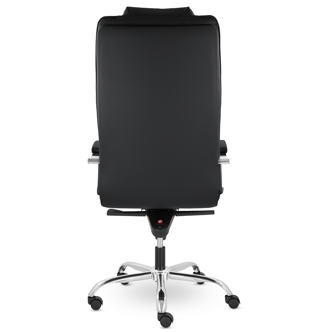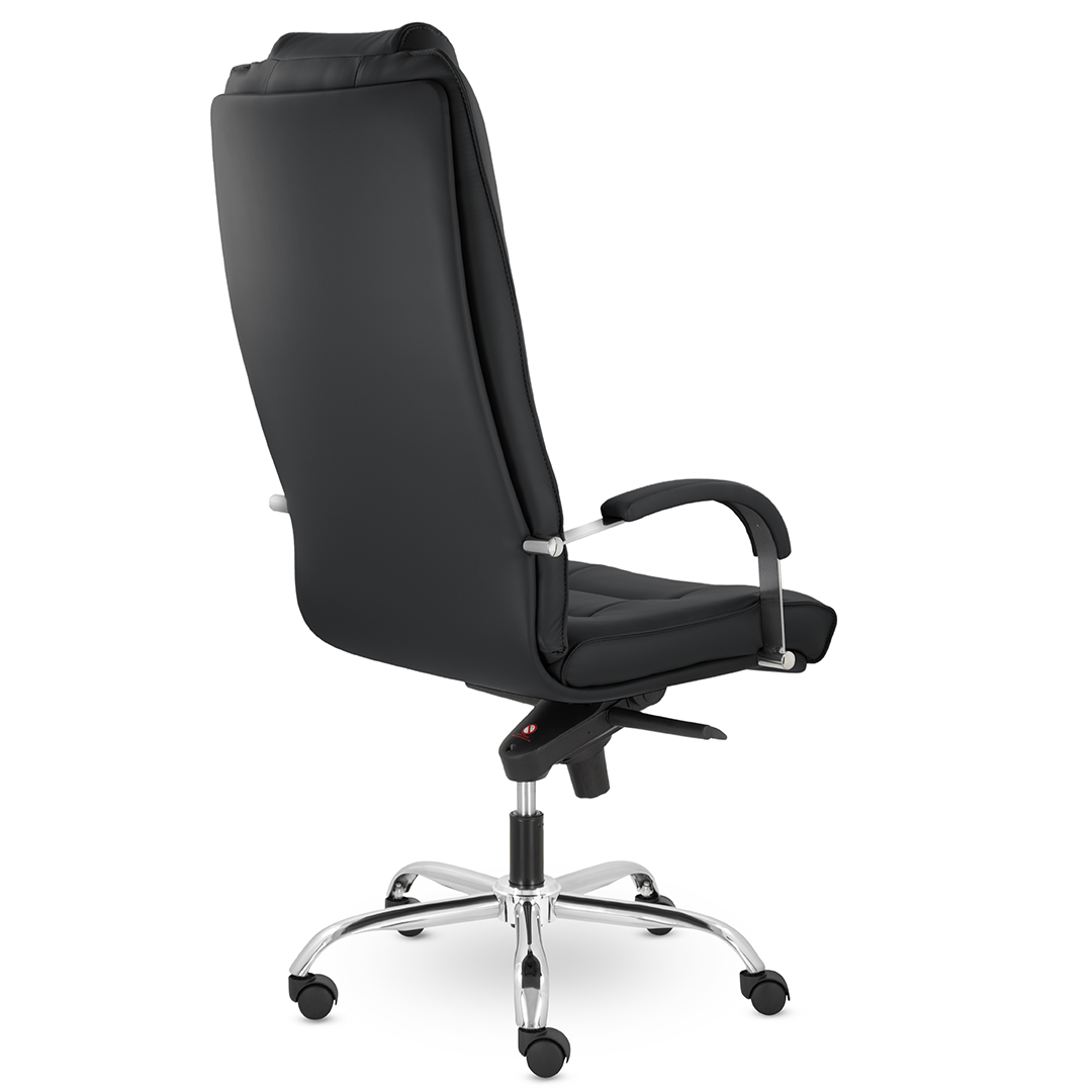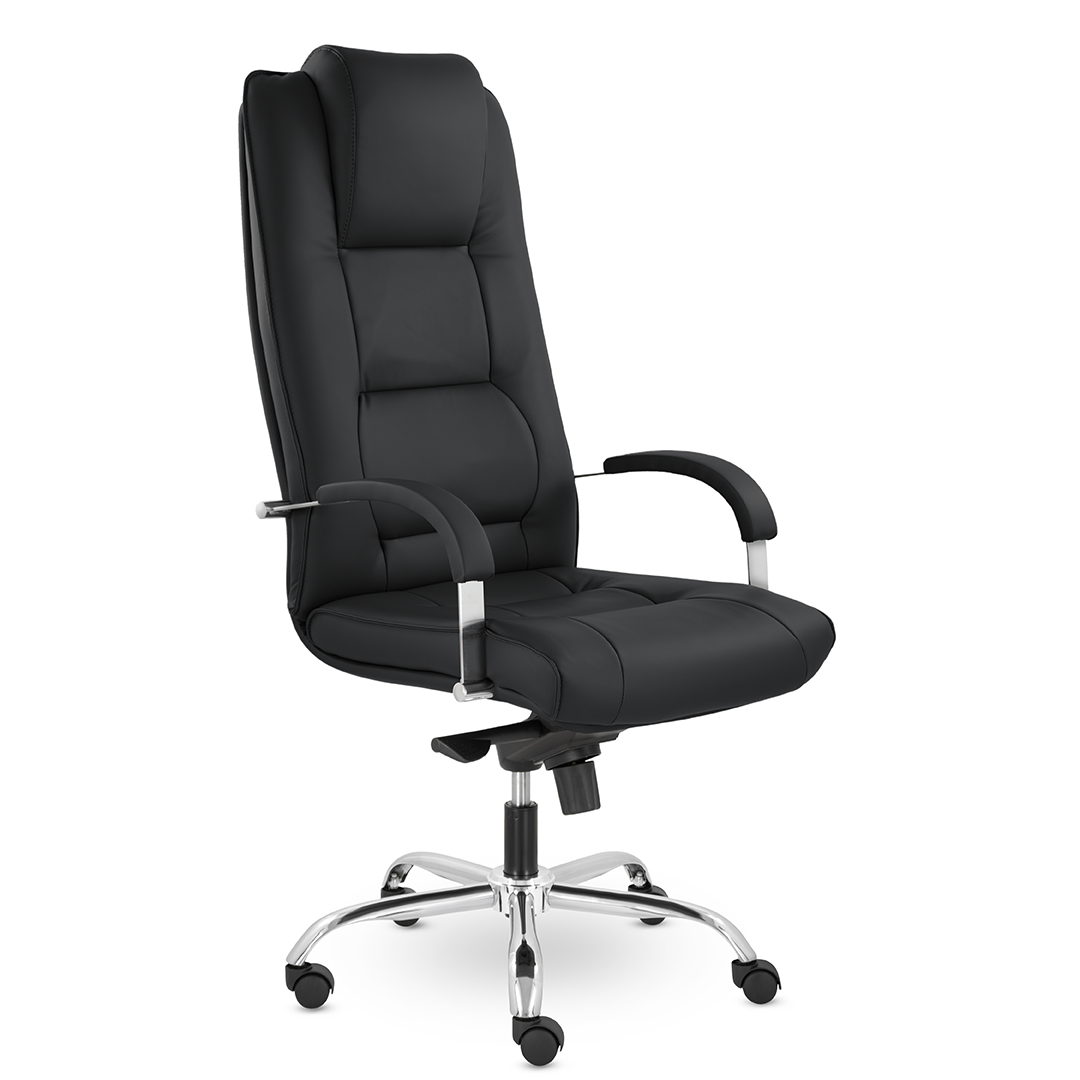 Грациозное кресло руководителя с ярко выраженным мягким подголовником. Спинка и сидение имеют горизонтальные прострочки, делящие их на квадраты. Хромированные подлокотники с мягкими накладками. Кресло стоит на хромированной крестовине, максимальная нагрузка которой 180 кг.
