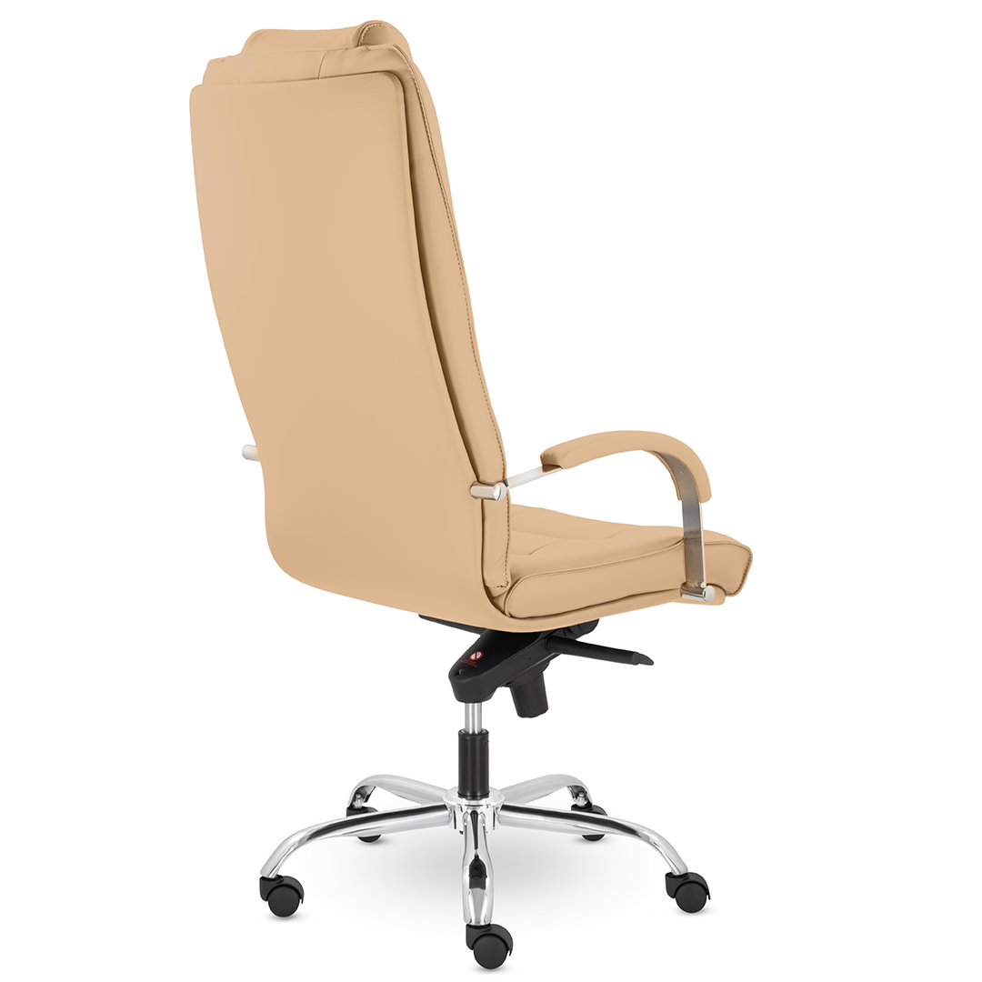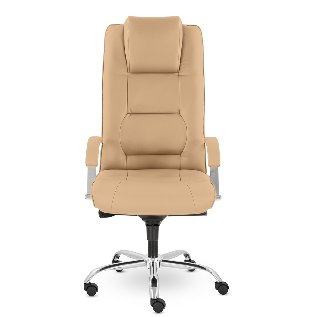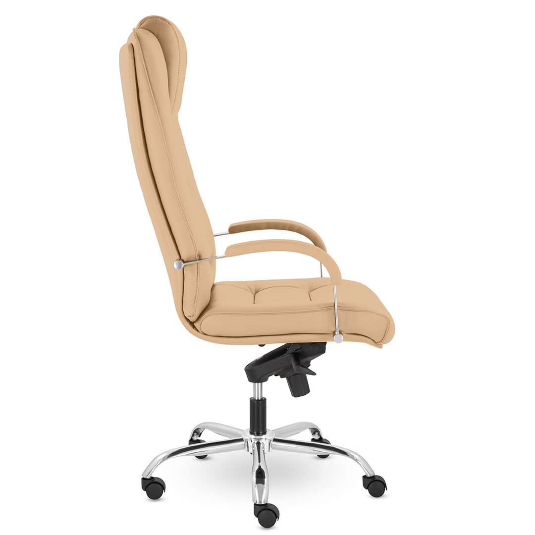 Грациозное кресло руководителя с ярко выраженным мягким подголовником. Спинка и сидение имеют горизонтальные прострочки, делящие их на квадраты. Хромированные подлокотники с мягкими накладками. Кресло стоит на хромированной крестовине, максимальная нагрузка которой 180 кг.
