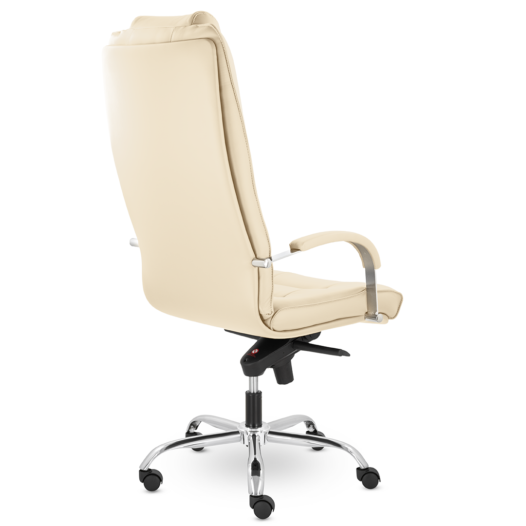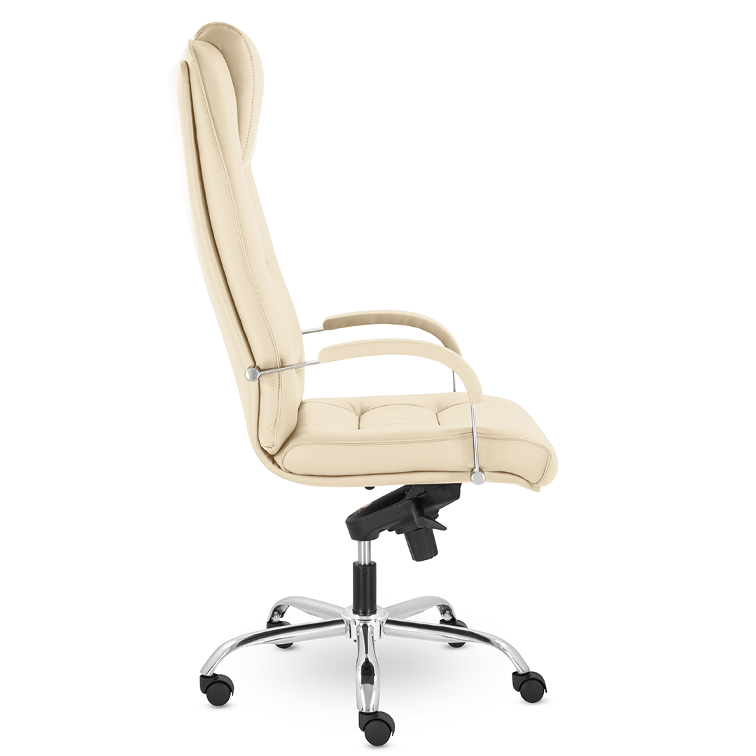 Грациозное кресло руководителя с ярко выраженным мягким подголовником. Спинка и сидение имеют горизонтальные прострочки, делящие их на квадраты. Хромированные подлокотники с мягкими накладками. Кресло стоит на хромированной крестовине, максимальная нагрузка которой 180 кг.