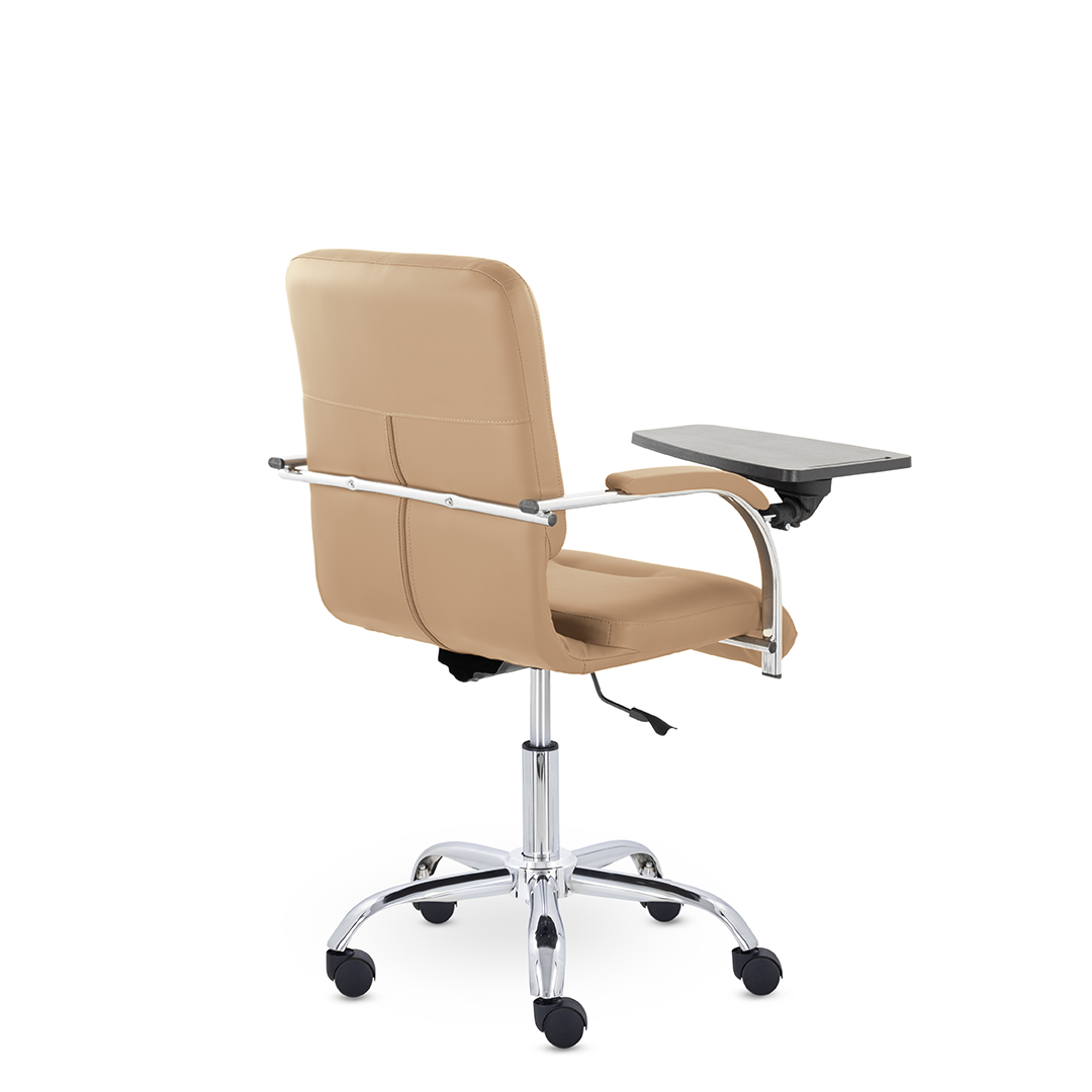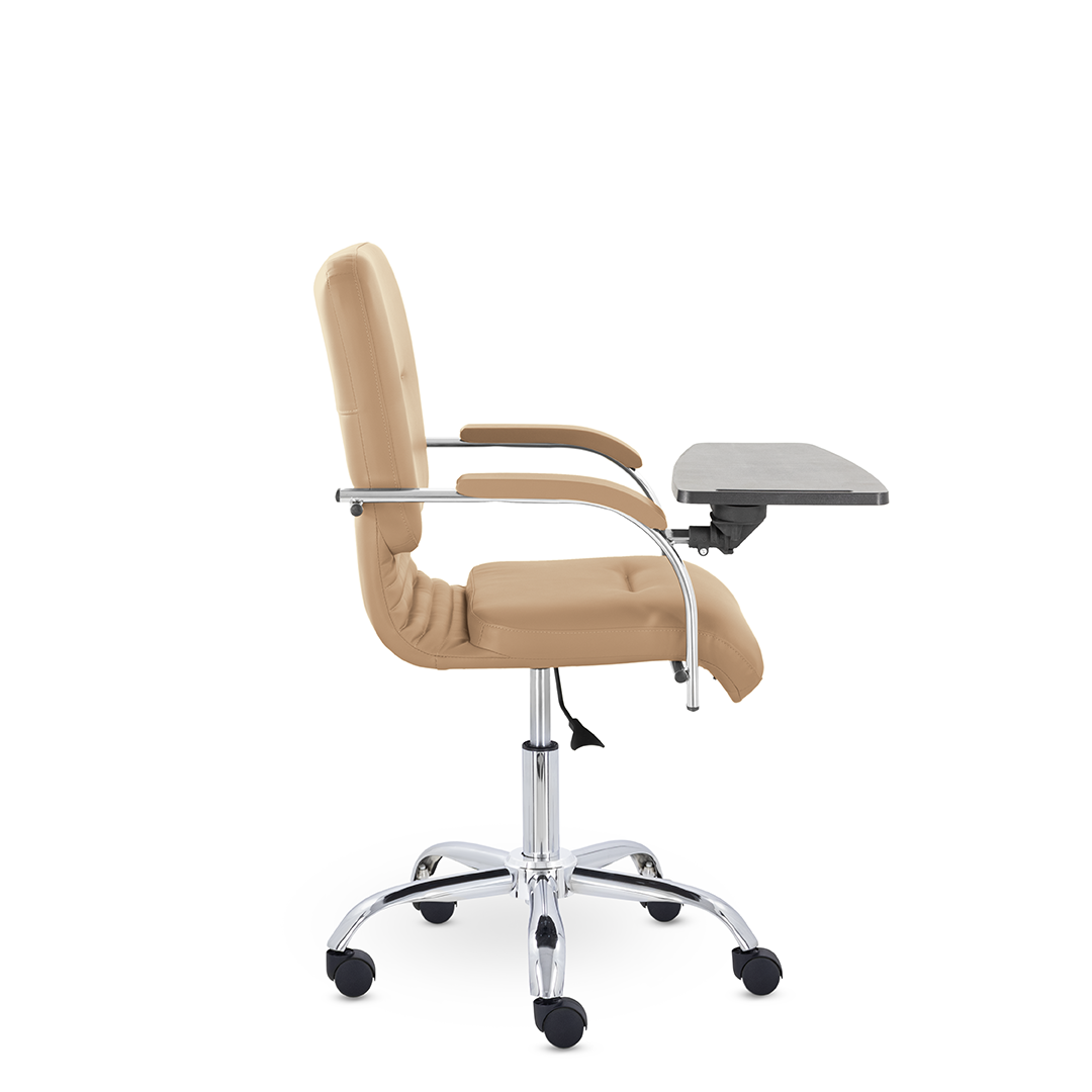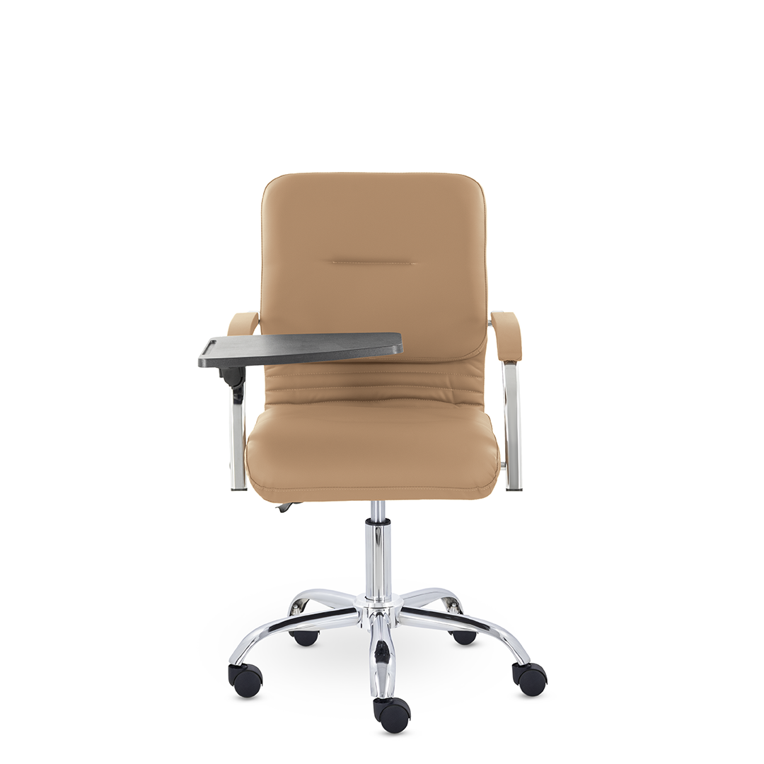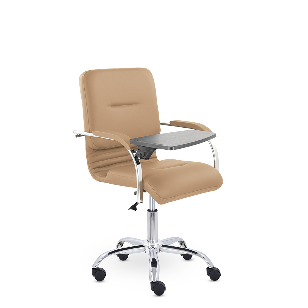 Улучшенная комплектация кресла включает горизонтальные прострочки, соединяющие спинку и сиденье, что придает креслу современный нео-классический стиль. Удобные накладки обеспечивают комфортную поддержку рук и способствуют их расслаблению. К креслу прилагается столик, выполненный из пластика. Модель отлично подойдет для конференц-залов, переговорных, актовых залов.