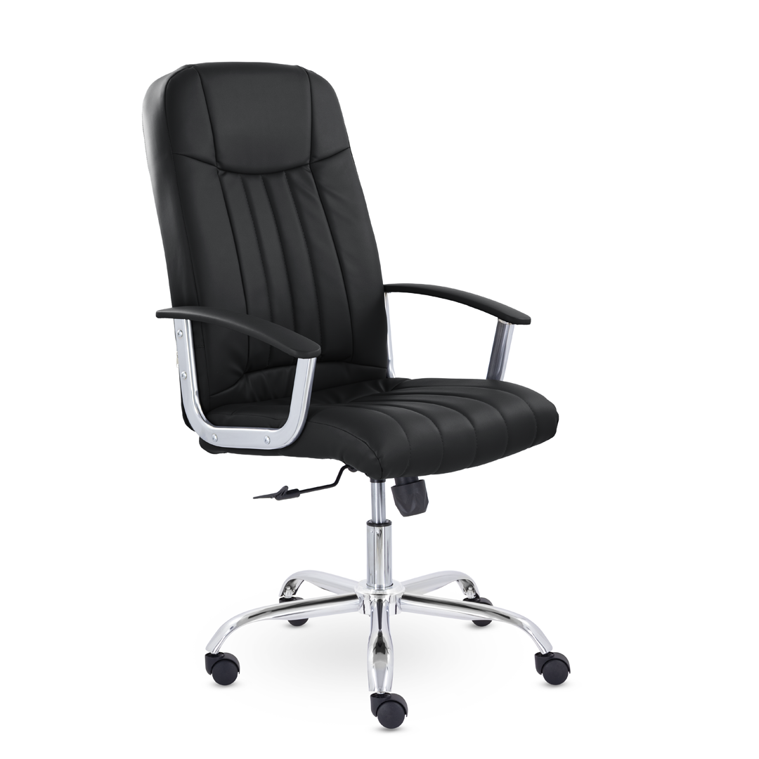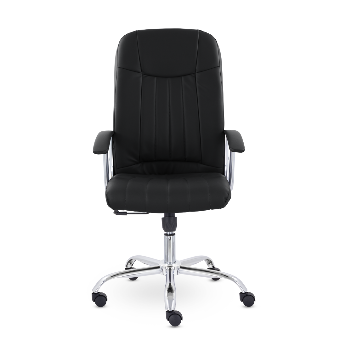 Кресло руководителя с мягкими увеличенными подушками. Широкая эргономичная спинка имеет две горизонтальные прострочки, которые отделяют подголовник от основной части спинки. Благодаря глубокому сиденью, в кресле будет удобно человеку среднего и высокого роста. Длинные хромированные подлокотники способствуют комфортной посадке в кресле. Максимальная нагрузка до 180 кг.