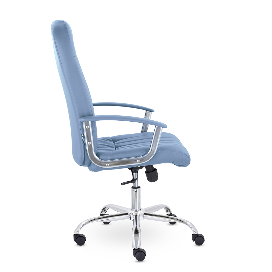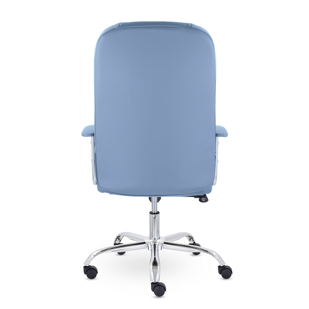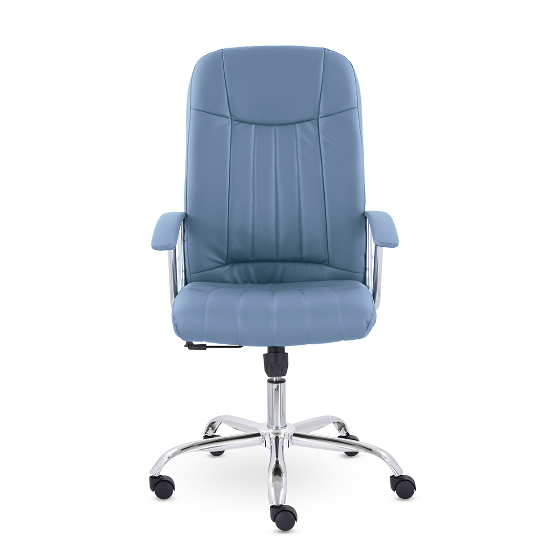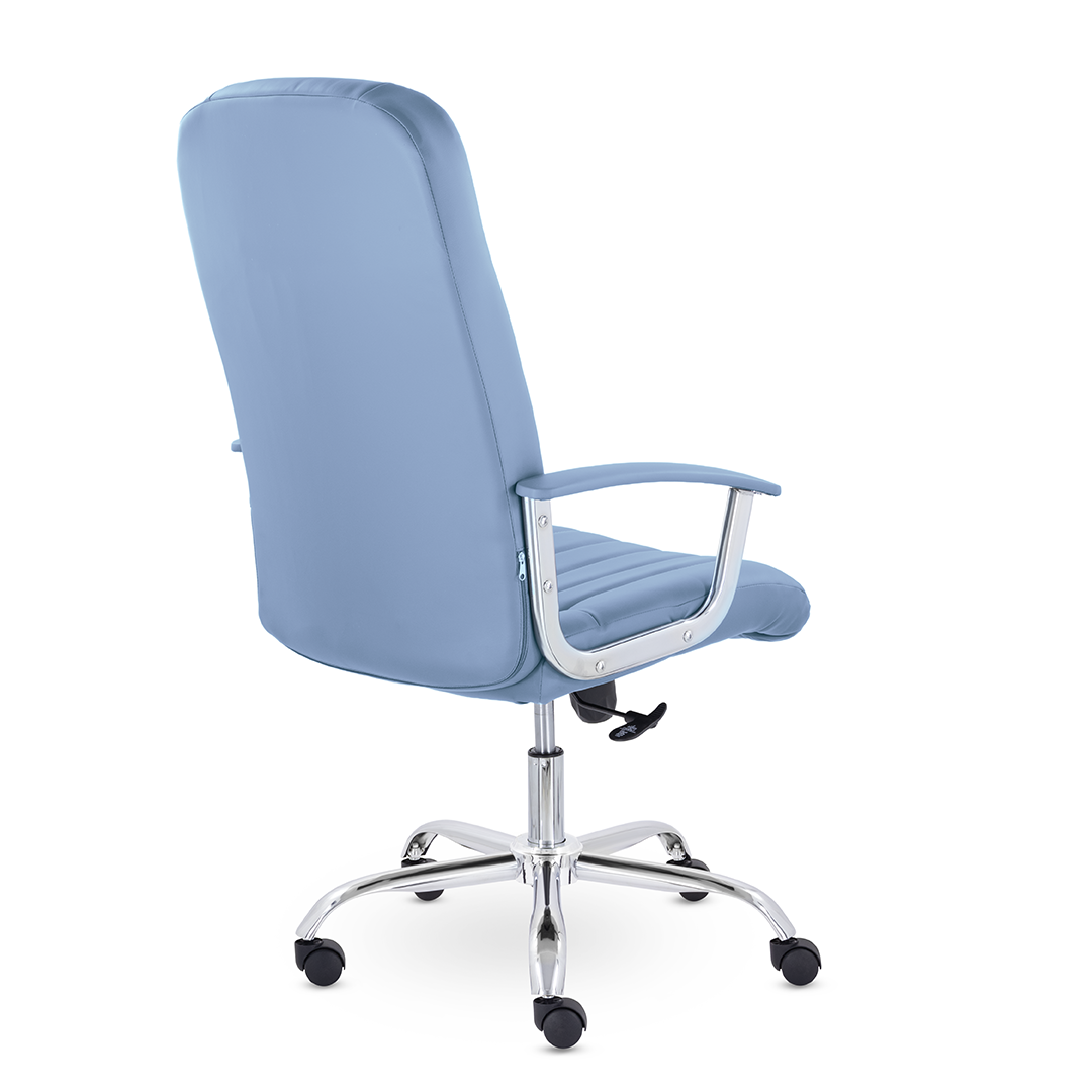 Кресло руководителя с мягкими увеличенными подушками. Широкая эргономичная спинка имеет две горизонтальные прострочки, которые отделяют подголовник от основной части спинки. Благодаря глубокому сиденью, в кресле будет удобно человеку среднего и высокого роста. Длинные хромированные подлокотники способствуют комфортной посадке в кресле. Максимальная нагрузка до 180 кг.