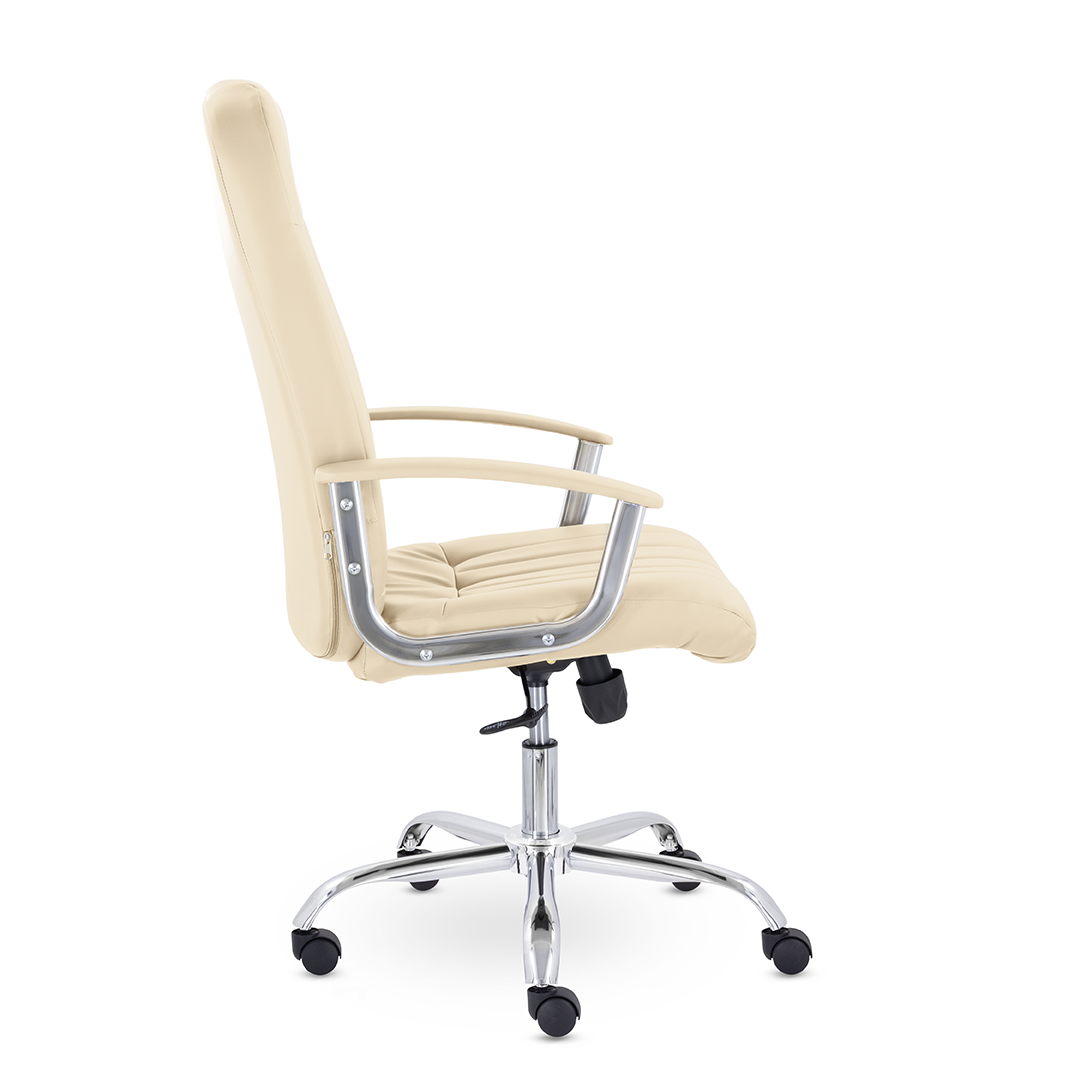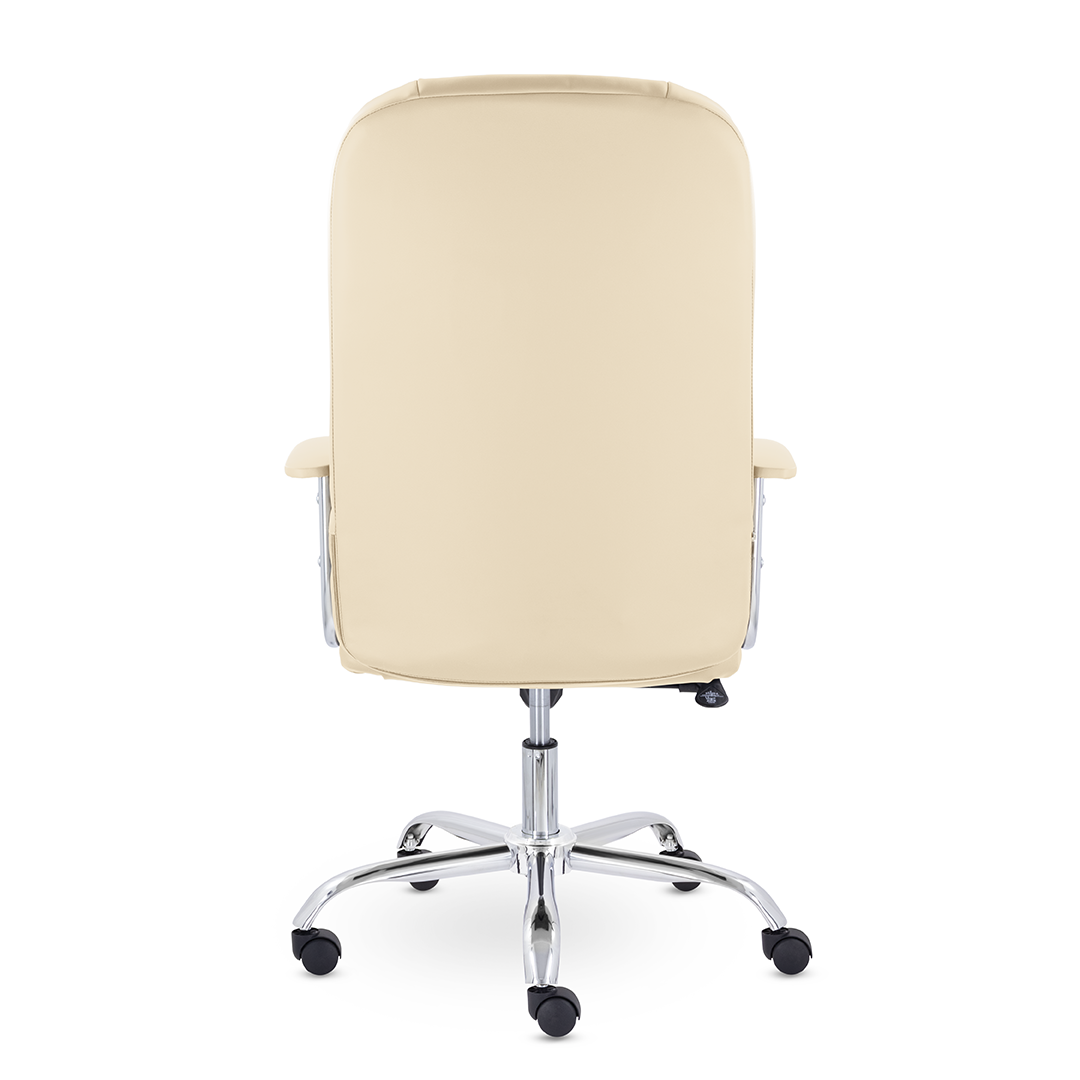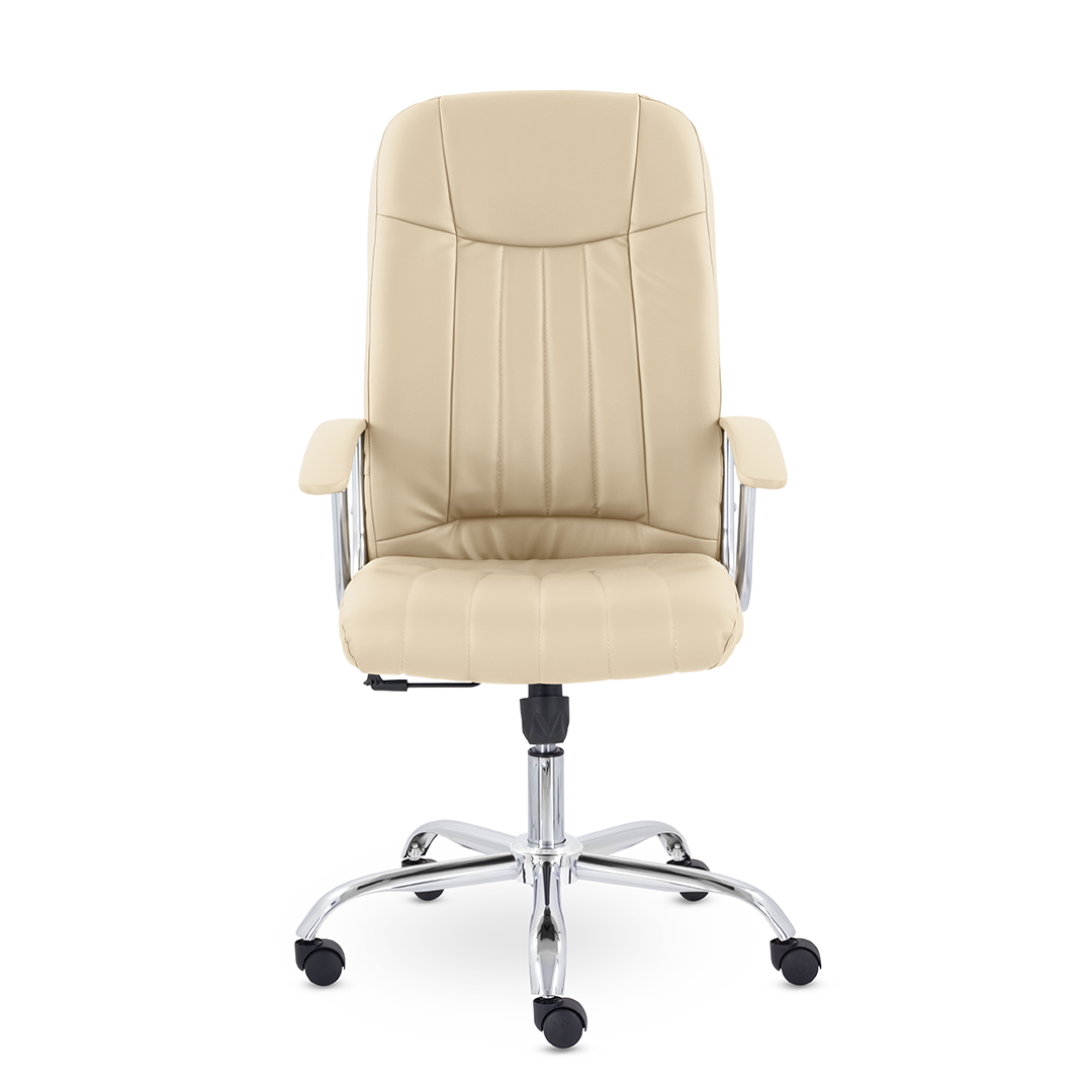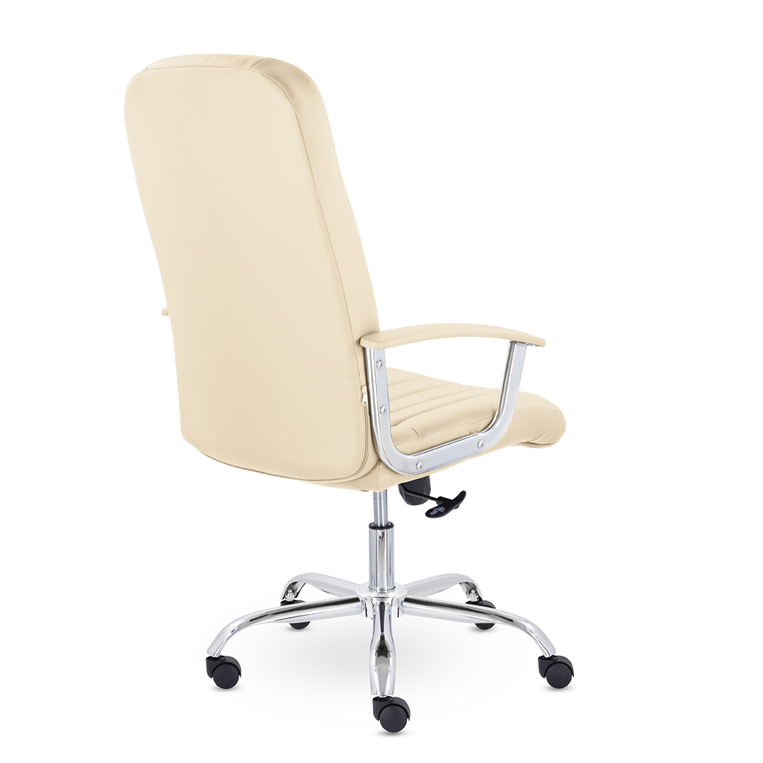 Кресло руководителя с мягкими увеличенными подушками. Широкая эргономичная спинка имеет две горизонтальные прострочки, которые отделяют подголовник от основной части спинки. Благодаря глубокому сиденью, в кресле будет удобно человеку среднего и высокого роста. Длинные хромированные подлокотники способствуют комфортной посадке в кресле. Максимальная нагрузка до 180 кг.