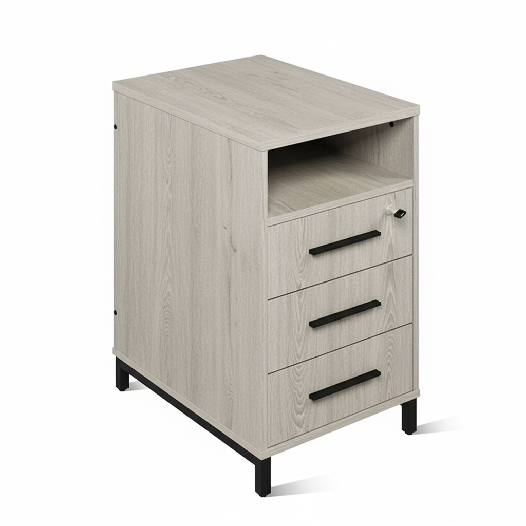 Эта тумба идеально подходит к эргономичным столам серии ЛОФТ. Верхний ящик оснащен встроенным замком, который надежно защищает вещи и документы. В комплекте с замком идет ключ. Черные металлические ручки ящиков подчеркивают современный стиль модели. Крышка выполнена из прочного ЛДСП толщиной 22 мм.Наверху тумбы расположена удобная открытая ниша, где можно разместить предметы, которые всегда должны быть под рукой. Черные металлические опоры также подчеркивают стиль ЛОФТ. Благодаря лаконичному дизайну, тумба отлично сочетается с мебелью из этой серии и другими стилями.