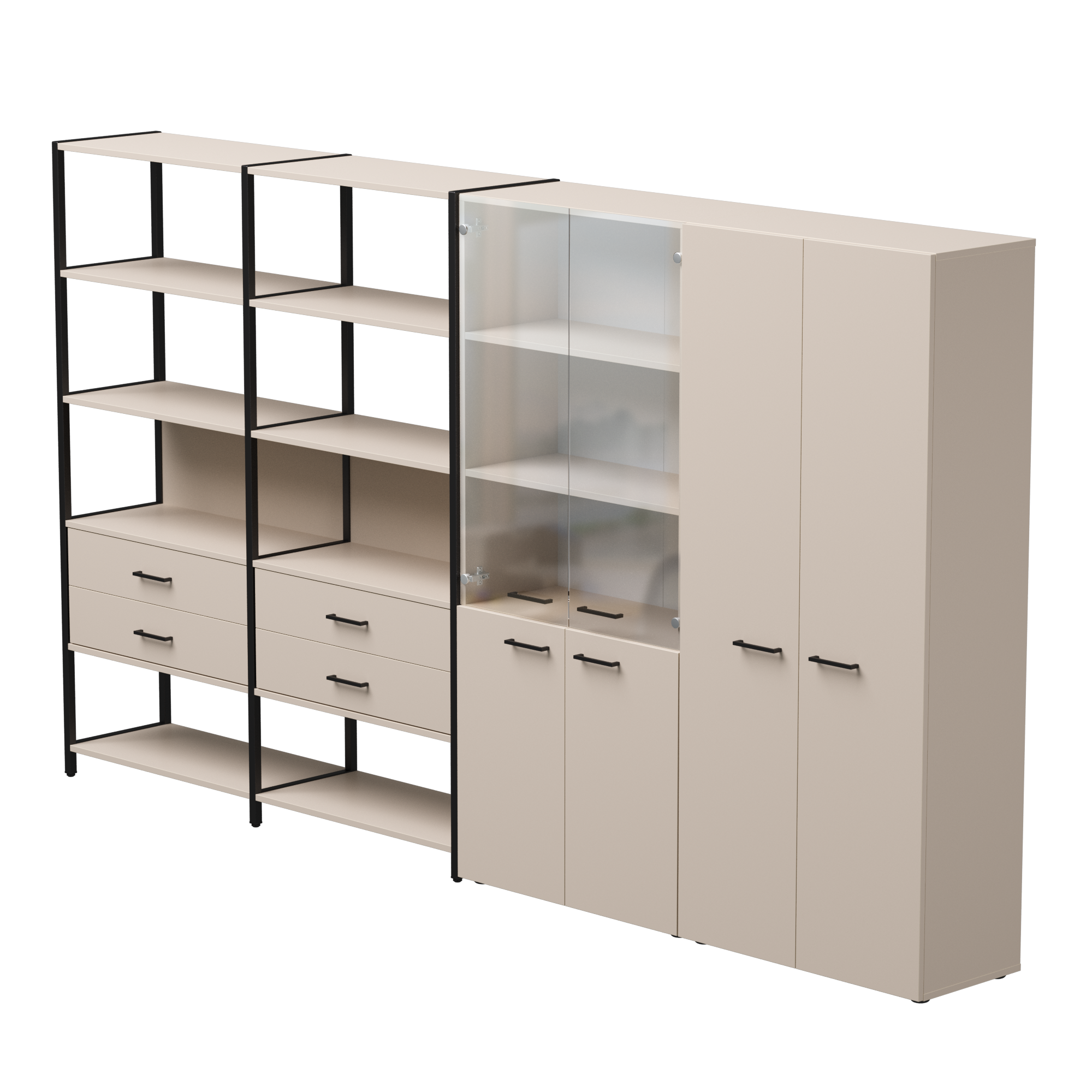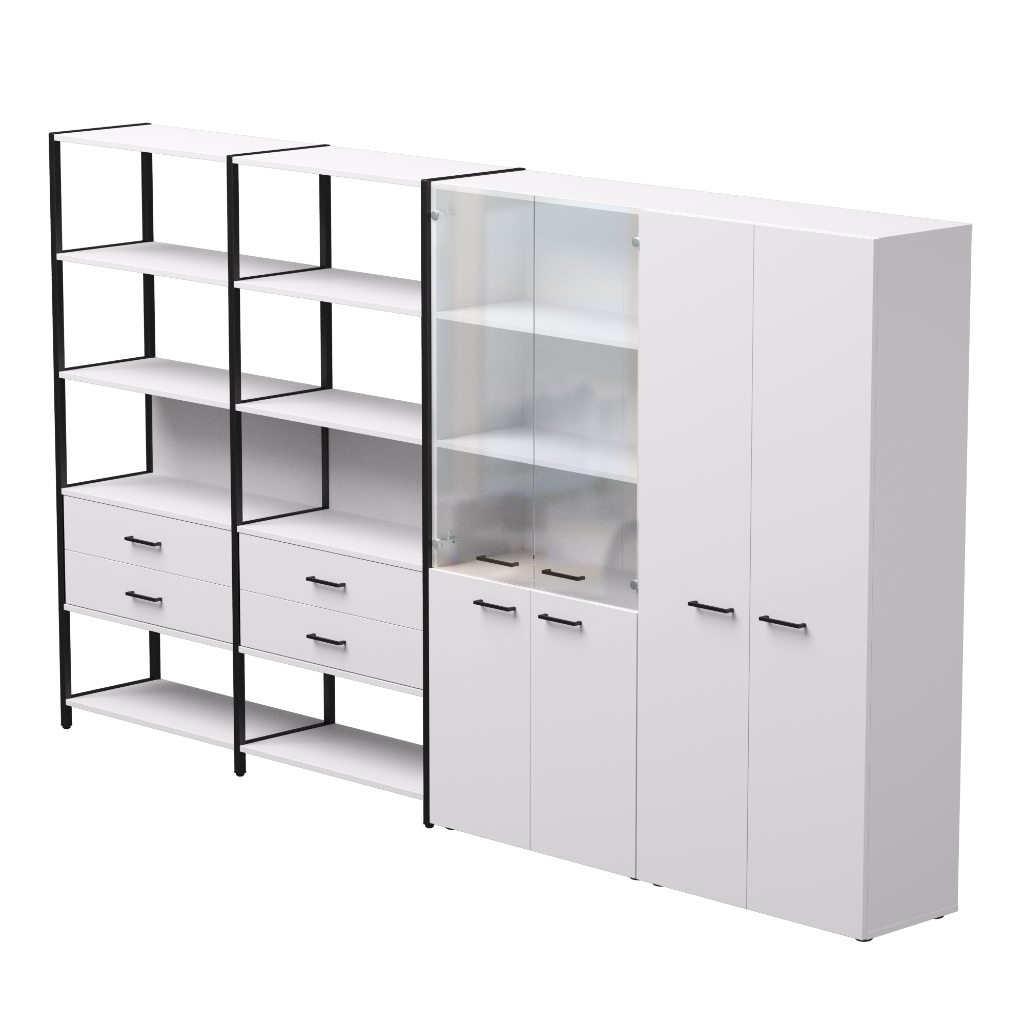 Материал каркаса | Металл; Цвет каркаса | Черный; Материал фасадов | ЛДСП/Стекло; Цвет фасадов | Белый; Длина | 3235 мм; Ширина | 385 мм; Высота | 1840 мм; Вес | 264,8 кг; Надставка/полка | ЛДСП Белый; Ящики | Модуль с ящиками;