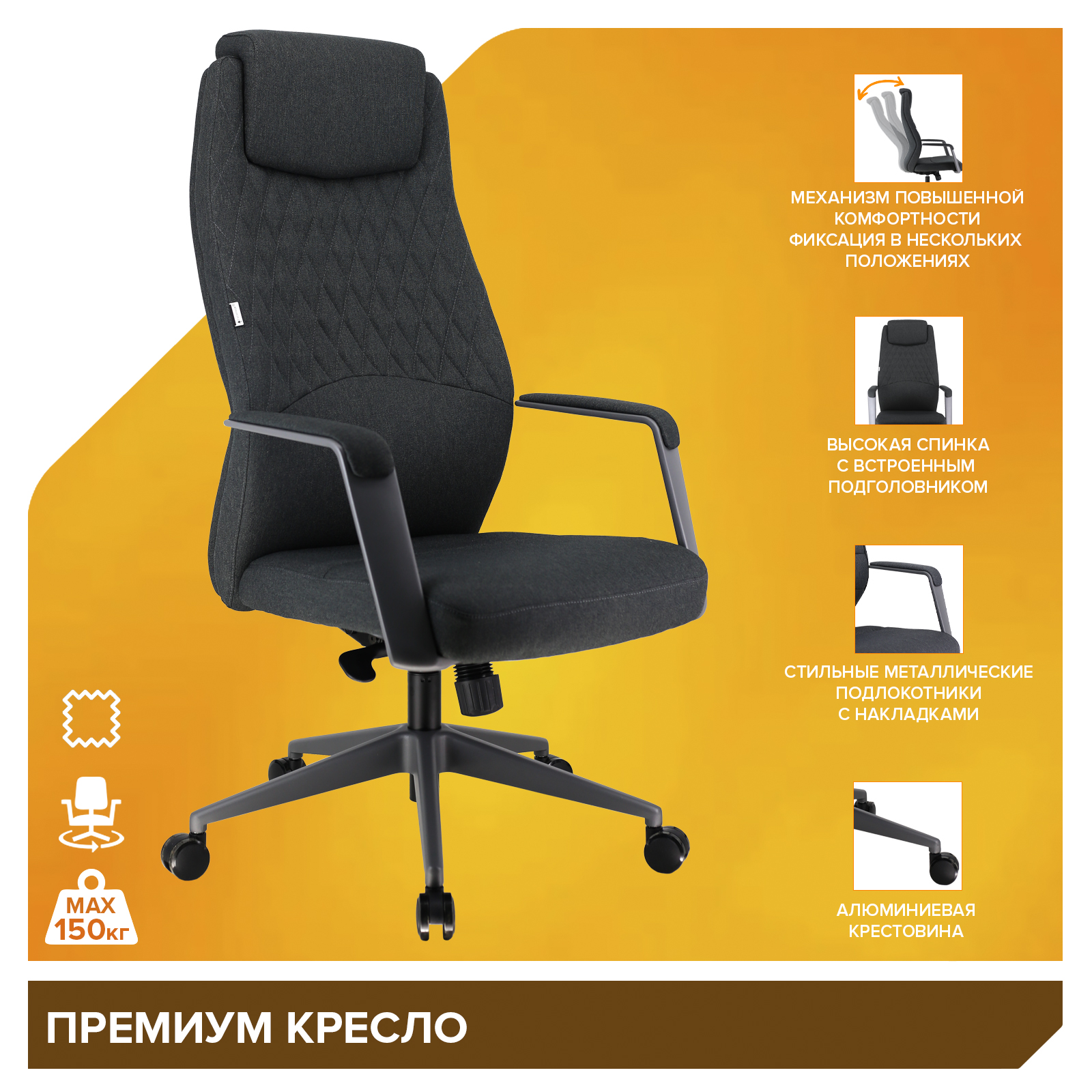 Подлокотники | Металлические с накладками из ткани; Подголовник | Встроенный; Поясничная поддержка | Нерегулируемая; Механизм качания | Мультиблок с синхроплатой - механизм повышенной комфортности с возможностью фиксации кресла в нескольких положениях; Крестовина | Крестовина алюминиевая; Газ патрон | Да. 4 категории по стандарту Germany DIN 4550; Ролики | Для паркета. Диаметр штока 11 мм.; Каркас | Немонолитный; Материал обивки | Ткань; Материал набивки | Вспененный полиуретан плотностью 22-25 кг/куб.м; Цвет | Темно-серый; Допустимая нагрузка | 150 кг; Инструкция по сборке | 23077; Поясничная поддержка | Нерегулируемая; Материал набивки | Вспененный полиуретан плотностью 22-25 кг/куб.м; Высота упаковки | 650; Ширина упаковки | 340; Максимальная высота (всего кресла) | 1300; Минимальная высота (всего кресла) | 1230; Минимальная высота сиденья | 490; Максимальная высота сиденья | 560; Ширина сиденья | 500; Глубина сиденья | 500; Минимальная высота до подлокотников | 680; Максимальная высота до подлокотников | 750; Штук в упаковке | 1 шт. в коробке;