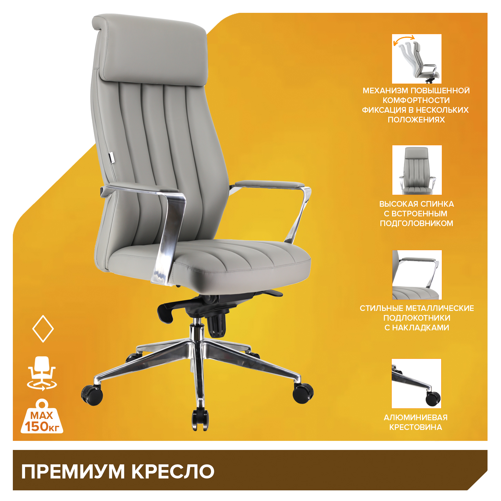 Подлокотники | Металлические с накладками из экокожи; Подголовник | Встроенный; Поясничная поддержка | Нерегулируемая; Механизм качания | Мультиблок - механизм повышенной комфортности с возможностью фиксации кресла в нескольких положениях; Крестовина | Крестовина алюминиевая; Газ патрон | Да. 4 категории по стандарту Germany DIN 4550; Ролики | Для паркета. Диаметр штока 11 мм.; Каркас | Немонолитный; Материал обивки | Экокожа; Материал набивки | Вспененный полиуретан плотностью 25-40 кг/куб.м; Цвет | Серый; Допустимая нагрузка | 150 кг; Рост до 170см | 378; Рост 170 - 185см | 380; Рост 185 - 200см | 382; Инструкция по сборке | 22965; Поясничная поддержка | Нерегулируемая; Материал набивки | Вспененный полиуретан плотностью 25-40 кг/куб.м; Высота упаковки | 650; Ширина упаковки | 340; Максимальная высота (всего кресла) | 1330; Минимальная высота (всего кресла) | 1260; Минимальная высота сиденья | 510; Максимальная высота сиденья | 570; Глубина сиденья | 480; Минимальная высота до подлокотников | 710; Максимальная высота до подлокотников | 770; Штук в упаковке | 1 шт. в коробке;