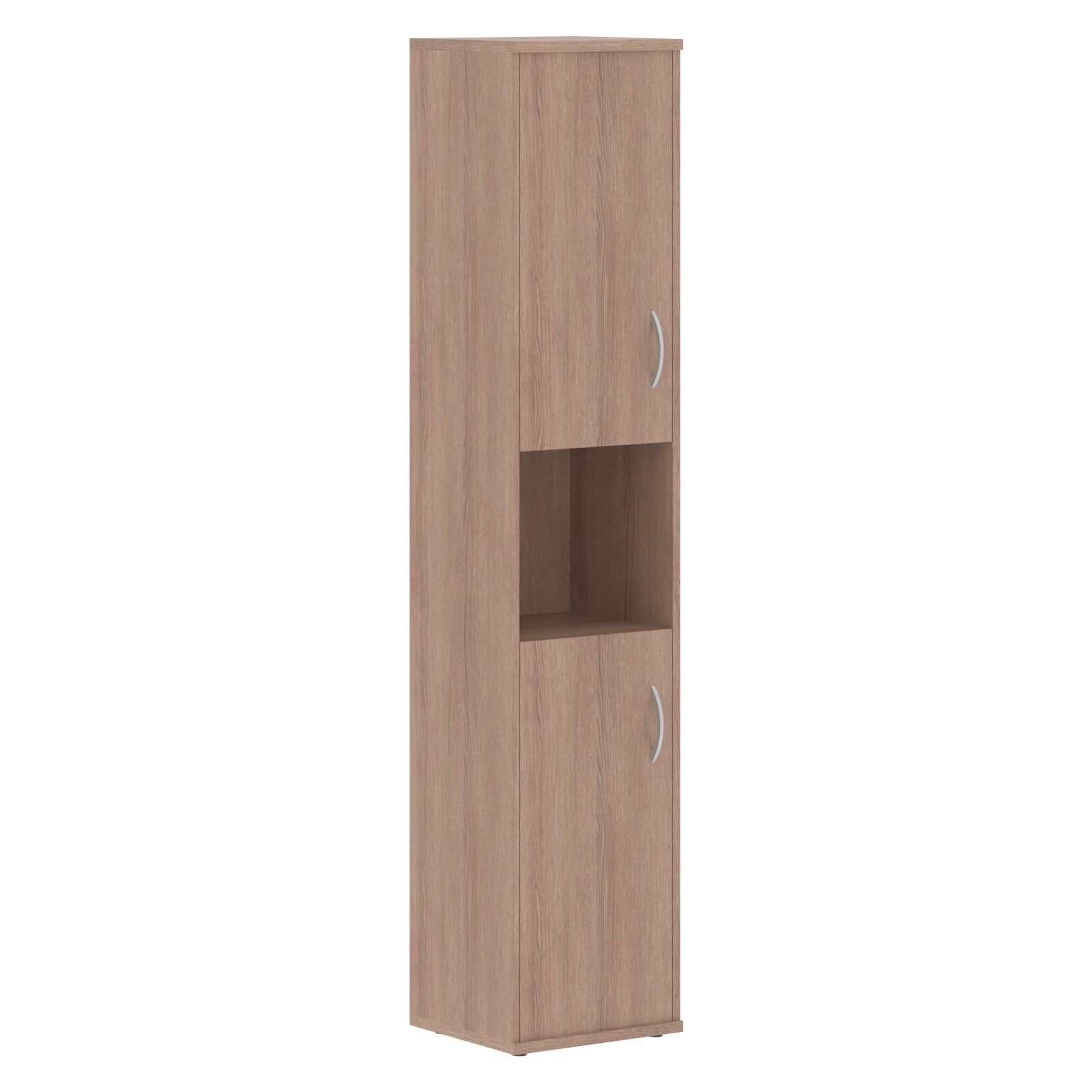Компактный и высокий шкаф IMAGO для офисного или домашнего использования. Размеры - 406х1975х365 мм, цвет – Ясень Шимо. Оснащен 5 просторными полочками, 2 нижние и 2 верхние отдельно закрываются дверцами из ЛДСП под цвет шкафа, а посередине одна открытая ниша. На всех дверцах установлены стильные металлические ручки. Конструкция оснащена прочными силовыми креплениями – эксцентриковыми стяжками. Все торцы основных элементов шкафа надежно защищены кромкой ПВХ – 2 мм. Регулируемые по высоте опоры обеспечат устойчивость на неровном полу.