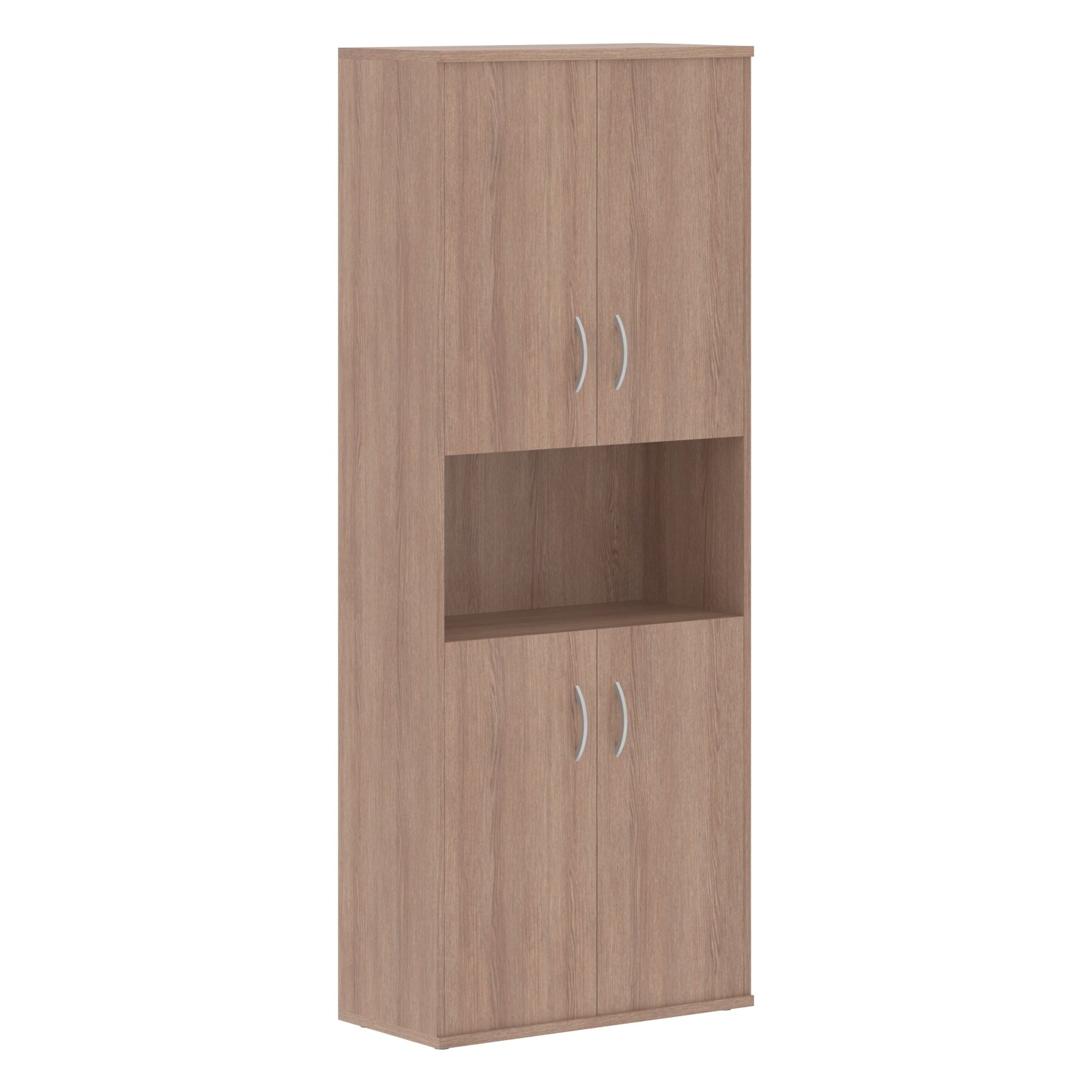 Универсальный комбинированный шкаф IMAGO для офисного или домашнего использования. Размеры -770х1975х365 мм, цвет – Ясень Шимо. Оснащен 5 просторными полочками, 2 нижние и 2 верхние отдельно закрываются дверцами из ЛДСП под цвет шкафа, а посередине одна открытая ниша. На всех дверцах установлены стильные металлические ручки. Конструкция оснащена прочными силовыми креплениями – эксцентриковыми стяжками. Все торцы основных элементов шкафа надежно защищены кромкой ПВХ – 2 мм. Регулируемые по высоте опоры обеспечат устойчивость на неровном полу.