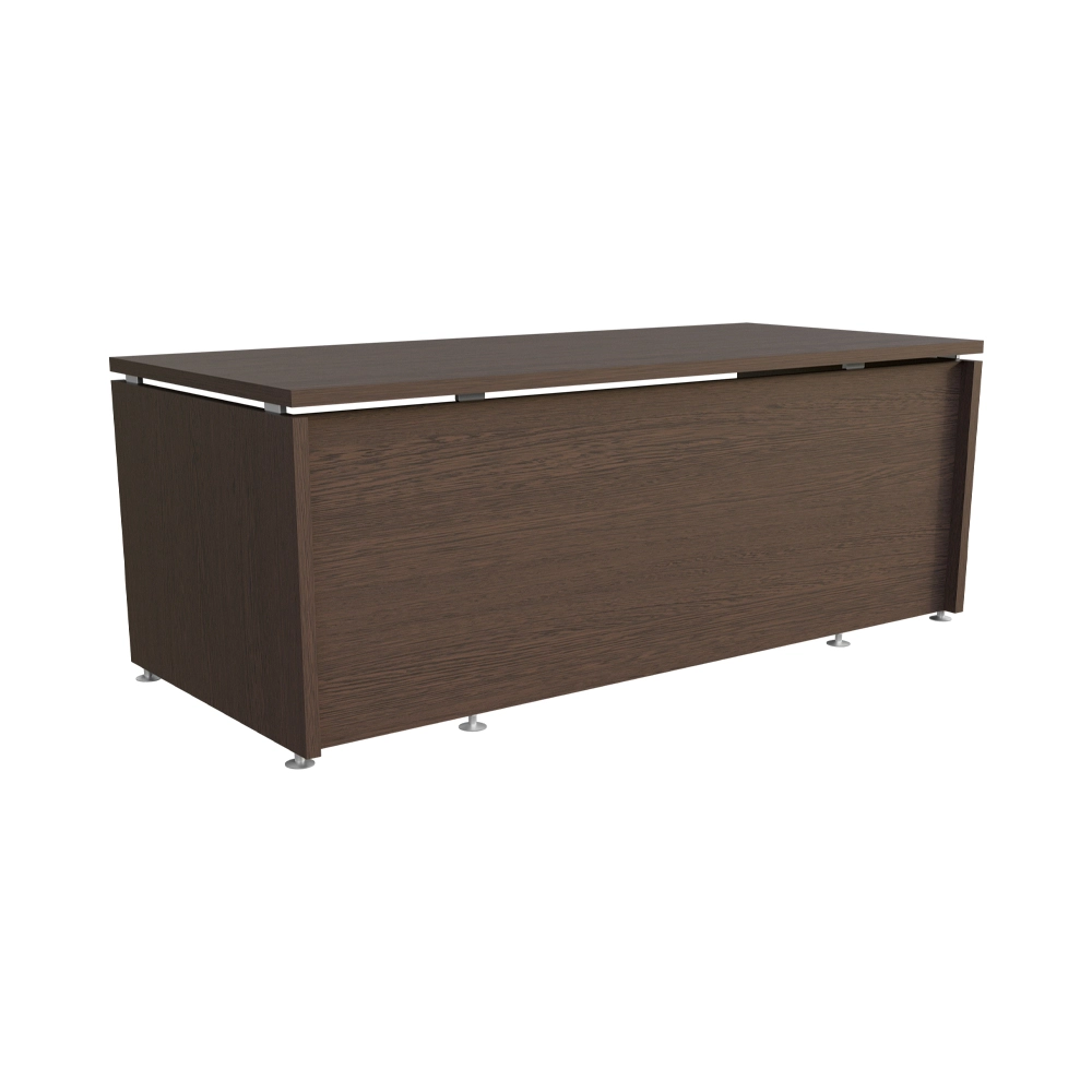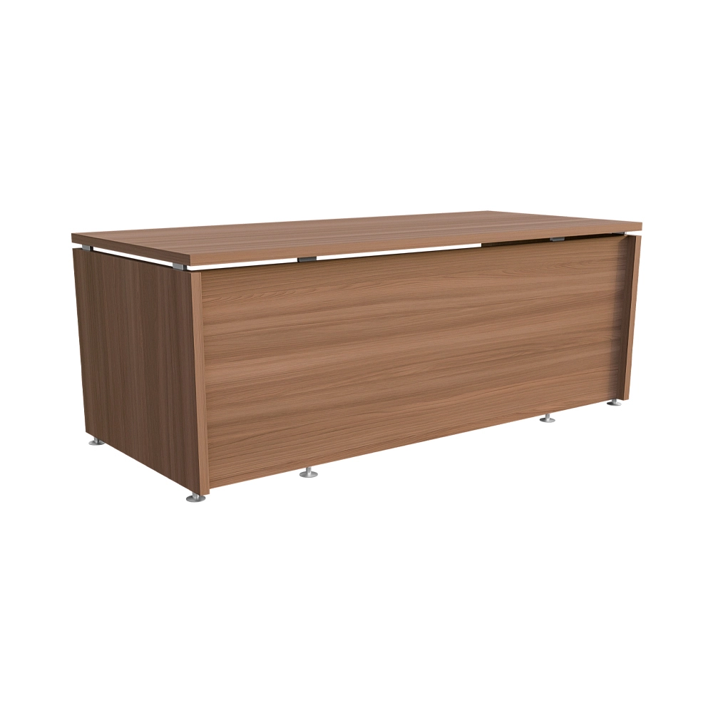 Письменный стол ПР103 коллекции «Президент-PRO». Столешница выполнена из деревоплиты с ламинированным покрытием (ЛДСП). Столешница и опоры имеют толщину 32 мм. Между столешницей и каркасом установлены проставки цвета металлик. Кромка покрыта лентой ПВХ толщиной 2 мм. Стол устанавливается на регулируемые по высоте опоры. Высота стола — 75 см, размеры столешницы — 200×87 см.