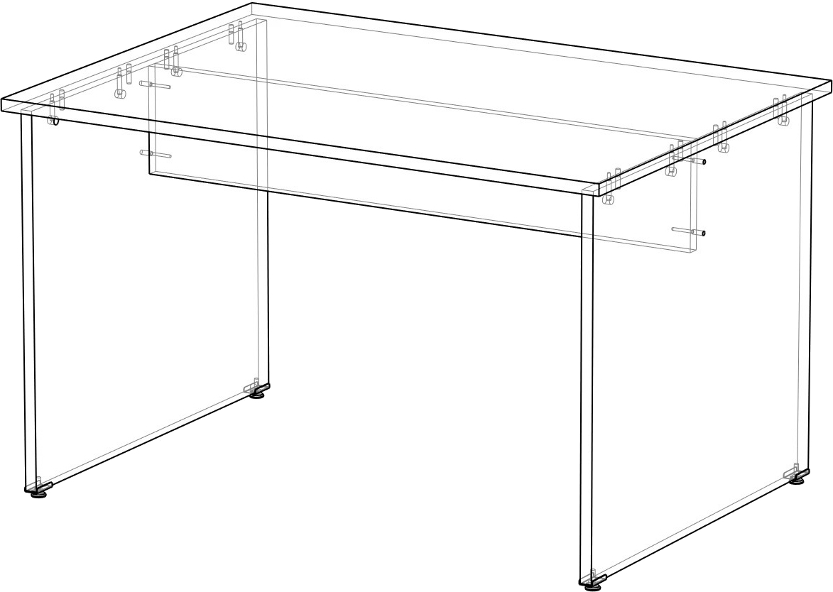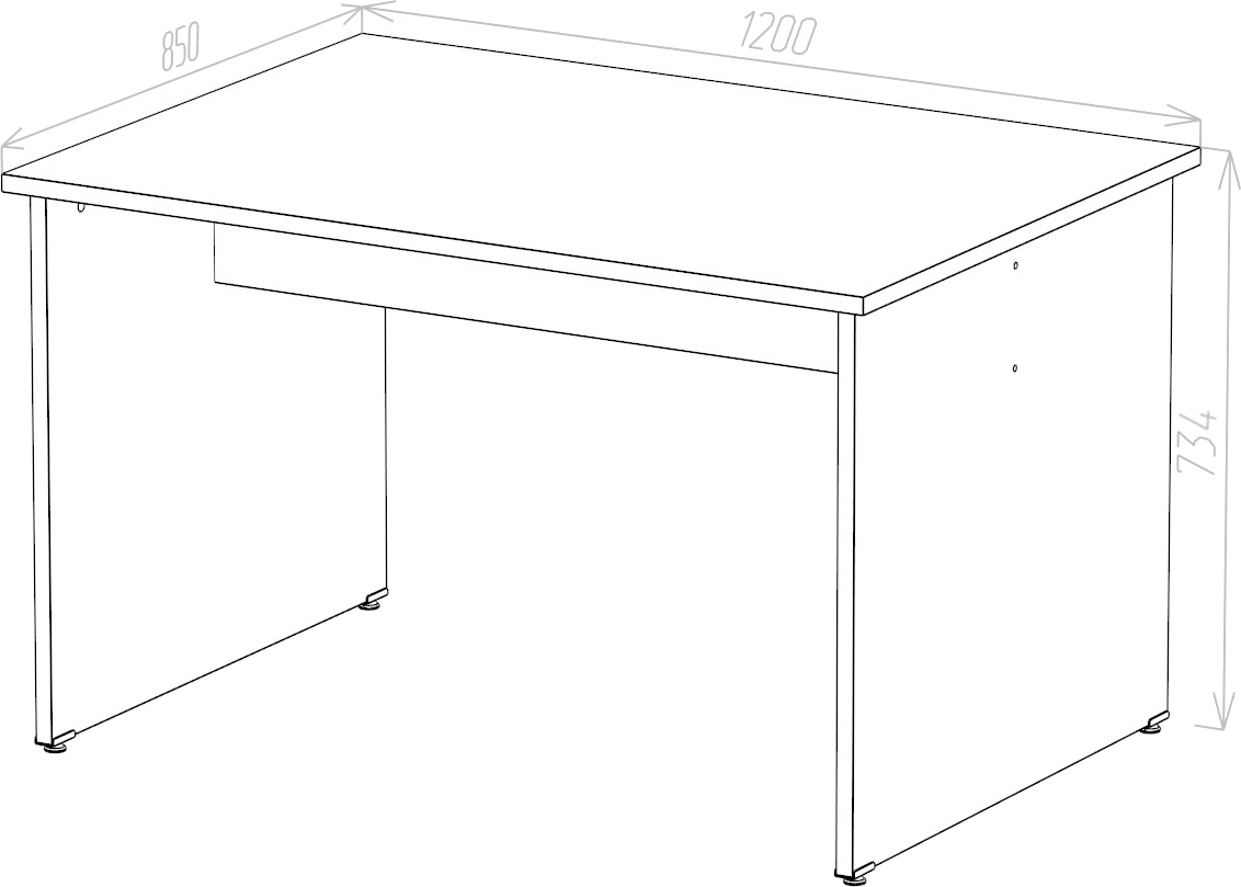 Стол изготовлен из ЛДСП толщиной 22 мм. Кромка ПВХ, на столешнице и видимых частях опор толщиной 2 мм, на невидиных частях 0,4 мм. Регулируемые по высоте опоры. Царга по середине, высотой 200 мм. Габариты изделия (длина, ширина, высота): 1200*850*734 Цвет изделия: ясень шимо темный