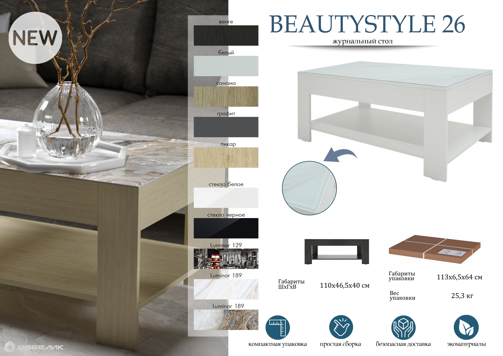 Стол журнальный Beauty Style 26 вполне может выполнять функцию рабочего стола современного творческого человека. При его внушительных размерах 60*110см только высота в 46см его отличает от полноценного письменного стола. Кроме большой рабочей поверхности, у стола есть удобная очень вместительная полка для книг, журналов, гаджетов, прочих мелочей. На таком столе можно легко сервировать завтрак, или легкий ужин. Этот стол будет уместен в гостиной, оформленной в современном строгом стиле.___ Журнальный столик с деревянной столешницей - не только украшение интерьера, но и весьма полезная в повседневной жизни вещь. Имея в своей обстановке журнальный столик, вы сможете хранить на нем тысячу ненужных вещей, сможете его быстро сервировать для нежданных гостей, редко, но сможете использовать его как стол письменный, кухонный, сервировочный, кофейный, или как туалетный столик. Стол журнальный - универсальная вещь. При выборе обратите внимание не только на габаритные размеры, но особенно на высоту. Если он будет стоять около дивана, то это особенно важно. Некрасиво, когда поверхность журнального стола выше сиденья, но и слишком низкие журнальные столики не всегда удобны - придется нагибаться. Сделайте свой выбор, а мы позаботимся о том, чтобы покупка стала для вас приятной. МАТЕРИАЛЫ: ЛДСП, столешница-стекло, опора - пластиковые подпятники. УПАКОВКА: 64х116х7 см, 1 место ВЕС: 25,3 кг Цвет: венге/стекло черное, венге/стекло белое, графит светлый U708/стекло белое, графит темный U961/стекло черное, дуб крафт золотой/стекло черное
