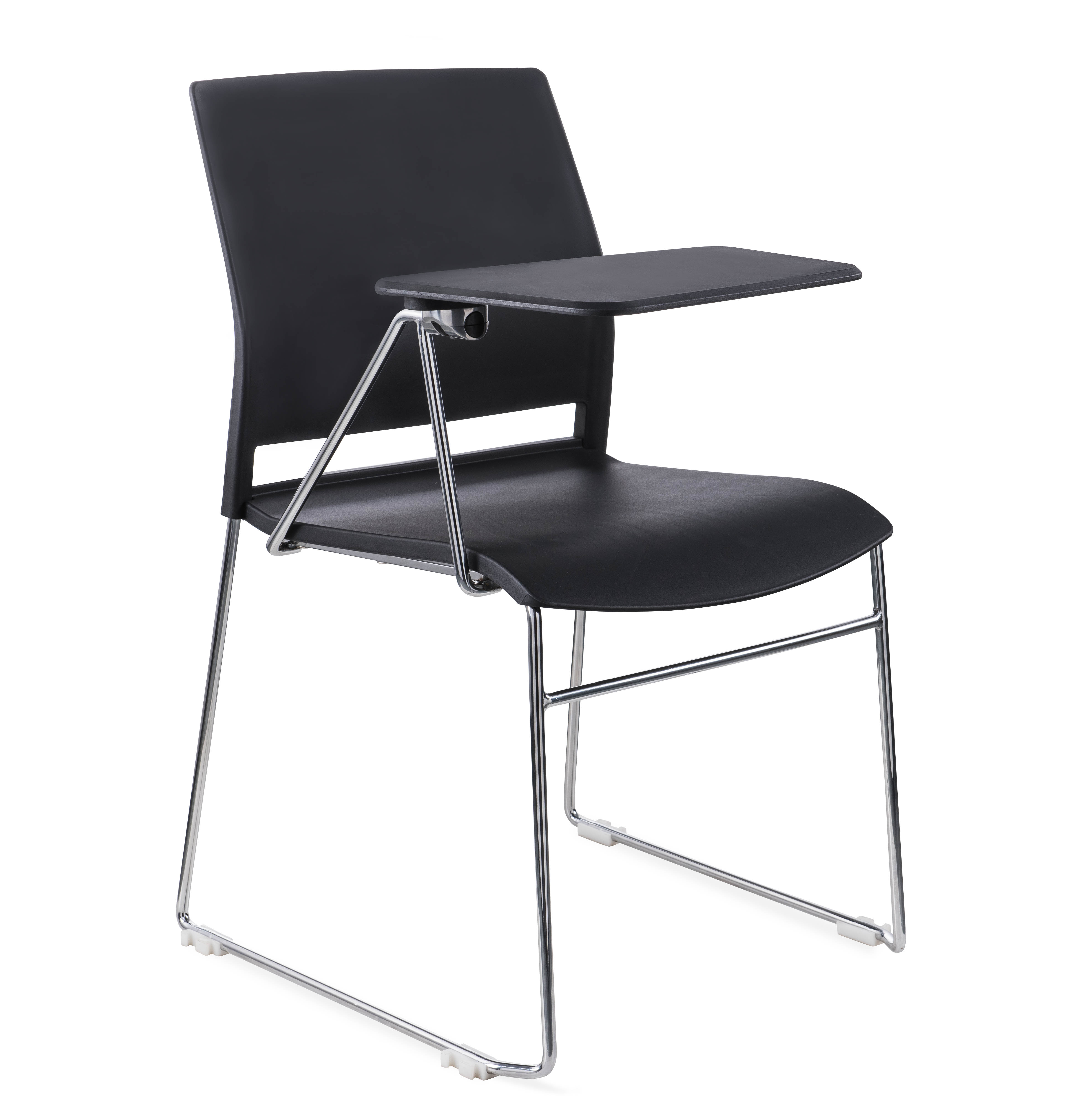 Современный офисный стул для учебных помещений и зон ожиданий. Пластик. Цвет черный. Основание металл, хром. Есть пюпитр с алюминиевым кронштейном. Выдерживает 15 кг. Стул выдерживает нагрузку до 90 кг.
