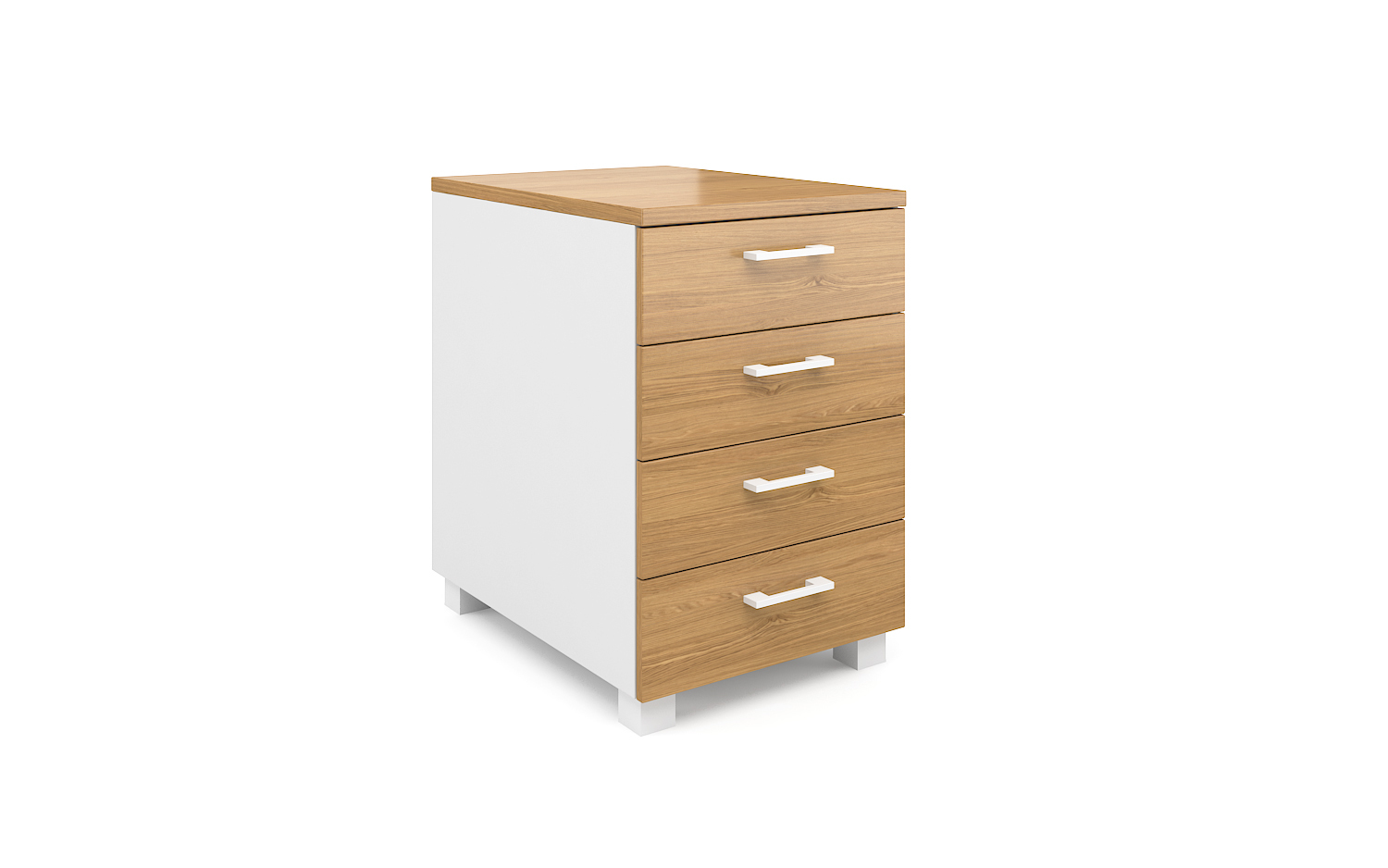 Опоры: выкатной тумбы - колесные, H-65 мм, белые; стеллажей, шкафов и приставных тумб – пластиковые, 60х60х60, белые.