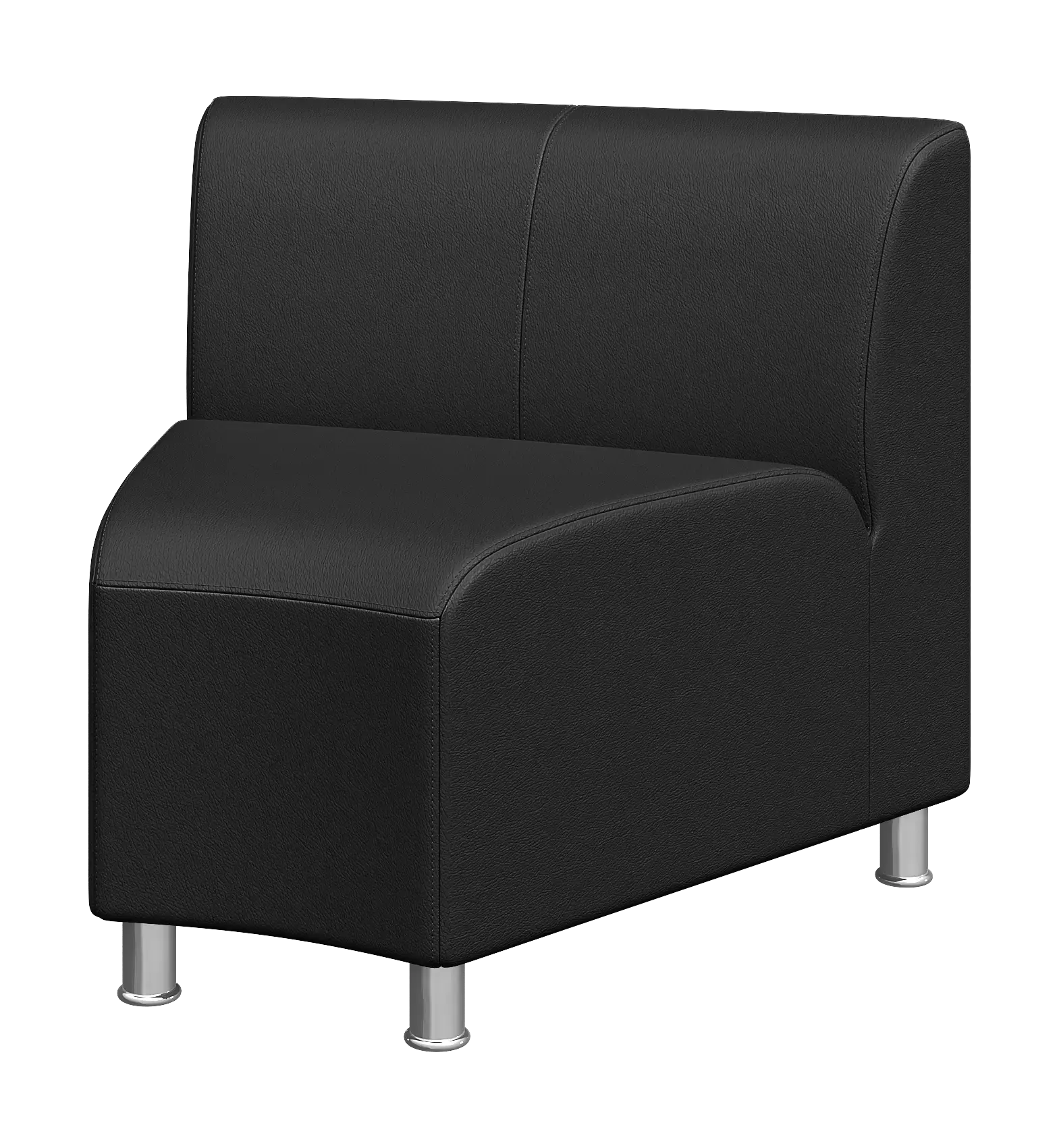 Обивка изготовлена из искусственной кожи с одинарным швом шириной 5 мм. Спинки модулей имеют наклон 13°, а сиденья остаются горизонтальными. Каждое изделие оснащено четырьмя металлическими опорами высотой 150 мм, выполненными из трубы диаметром 50 мм с глянцевым хромовым покрытием. В верхней части опор приварены крепежные пластины с минимум четырьмя точками крепления. Для компенсации неровностей пола в нижней части опор предусмотрены регулировочные элементы с ходом 20 мм.